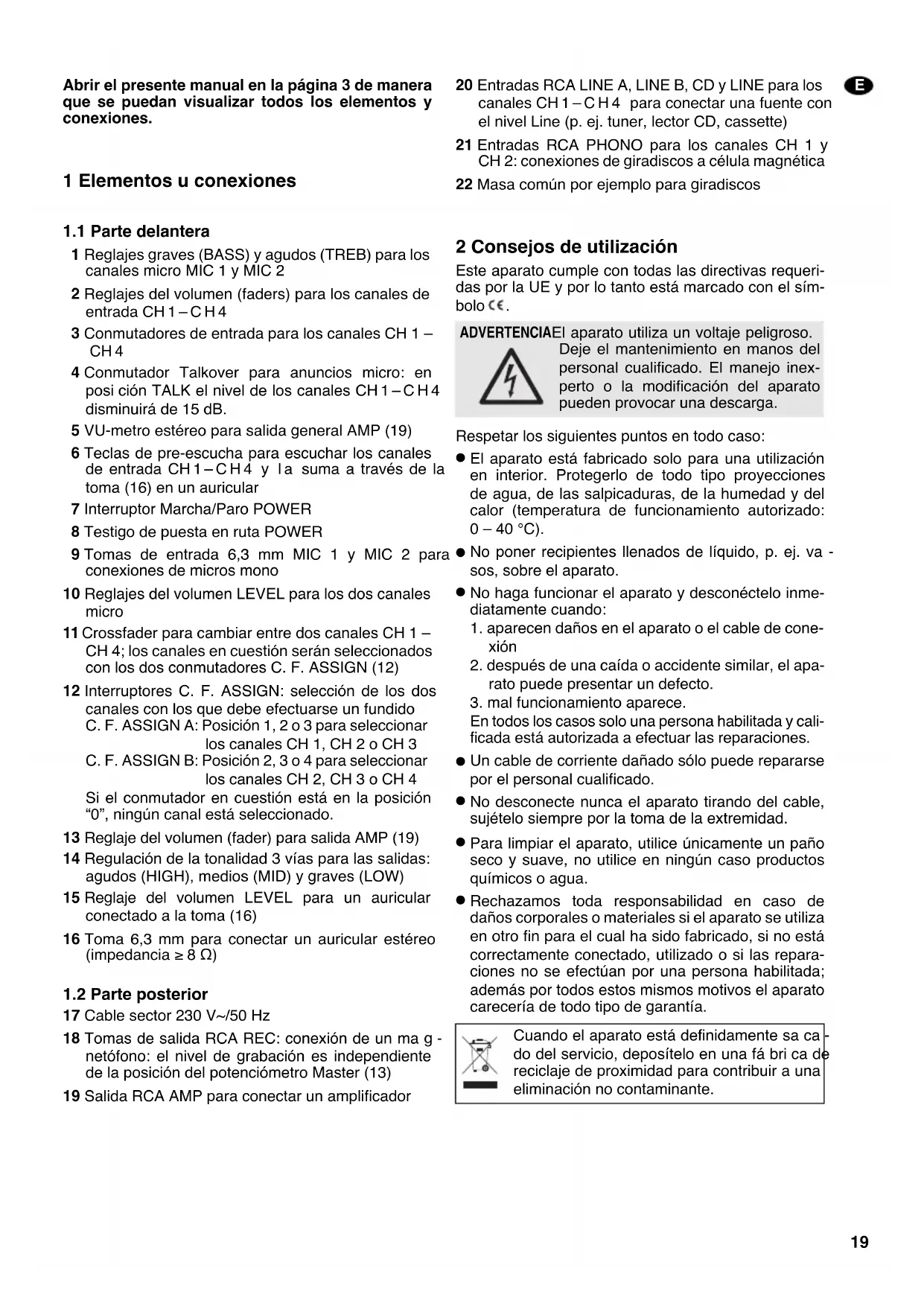 Antes de la primera connexion,poner el Conjunto de los potenciometros tonalidad (10 y 14) en la posicion mediana y el conmutador Talkover (4) en posicion OFF.Los dos conmutadores C.F. ASSIGN (12) deben estar direccion a ^ 出 "crossfader fauna增值服务).