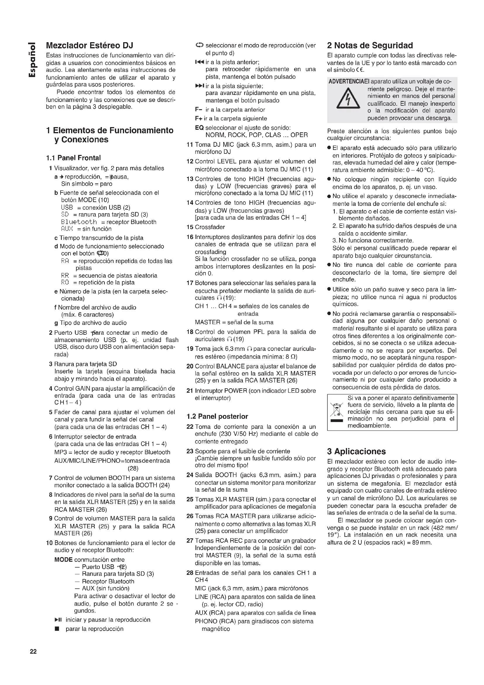El mezclador estéreo con lector de audio integra- y receptor Bluetooth está adequado para aplicaciones DJ privadas o profesionales y para un sistema de megafonia. El mezclador está equipado con quatre canales de entrada estéreo y un canal de microfono DJ. Los auriculares se pueben connectar para la esucha prefader de las sénas de entrada o de la senal de lasuma.