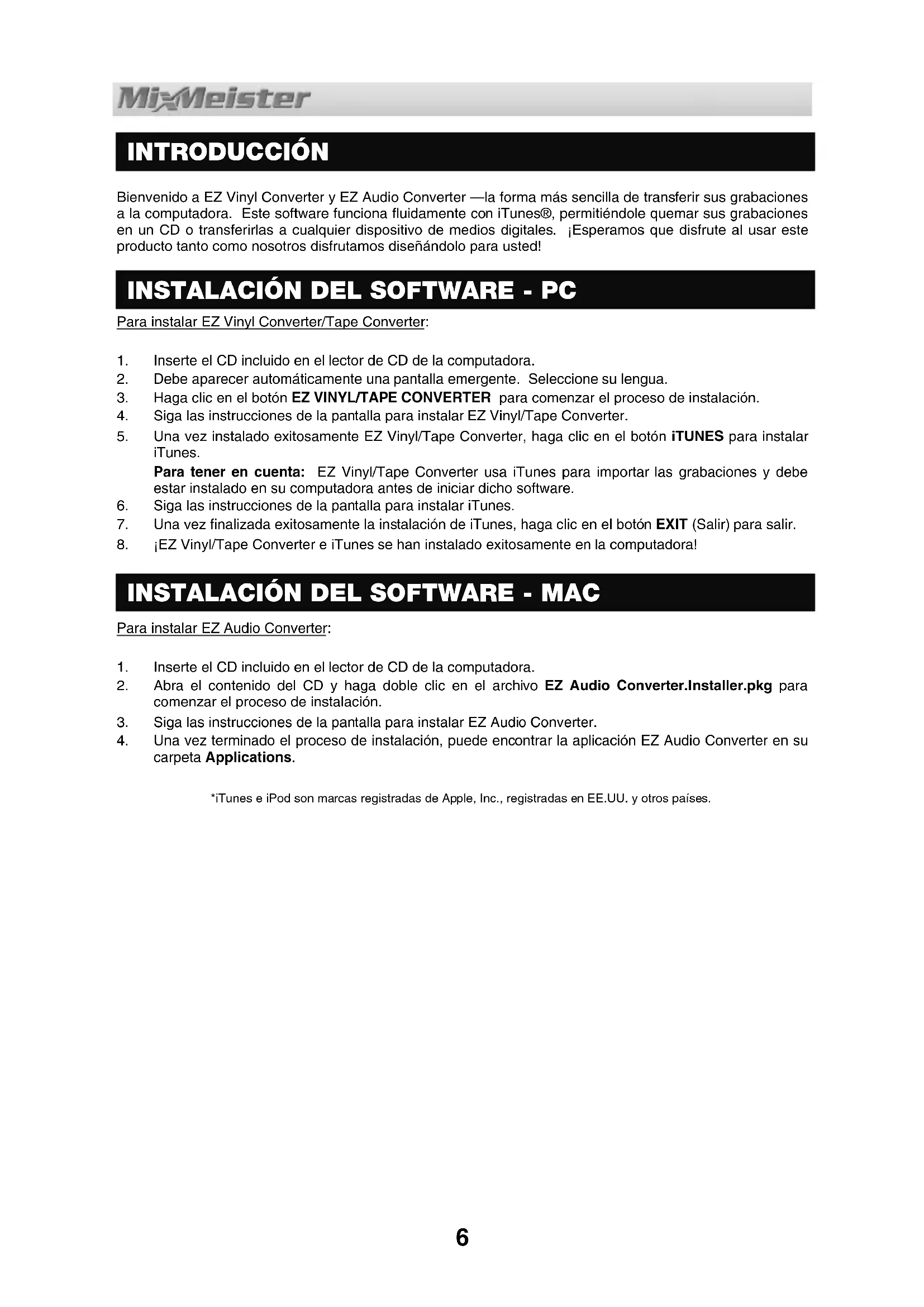 INTRODUCCIÓN Bienvenido a EZ Vinyl Converter y EZ Audio Converter —la forma más sencilla de transferir sus grabaciones a la computadora. Este software funciona fluidamente con iTunes®, permitiéndole quemar sus grabaciones en un CD o transferirlas a cualquier dispositivo de medios digitales. ¡Esperamos que disfrute al usar este producto tanto como nosotros disfrutamos diseñándolo para usted!