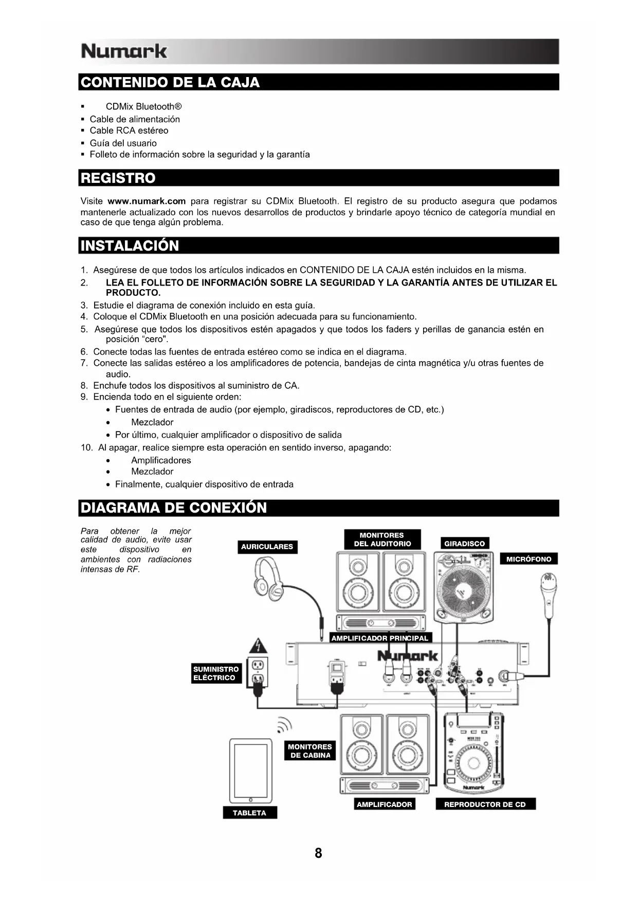 CDMix Bluetooth® Cable de alimentación Cable RCA estéreo Guía del usuario Folleto de información sobre la seguridad y la garantía REGISTRO Visite www.numark.com para registrar su CDMix Bluetooth. El registro de su producto asegura que podamos mantenerle actualizado con los nuevos desarrollos de productos y brindarle apoyo técnico de categoría mundial en caso de que tenga algún problema. INSTALACIÓN