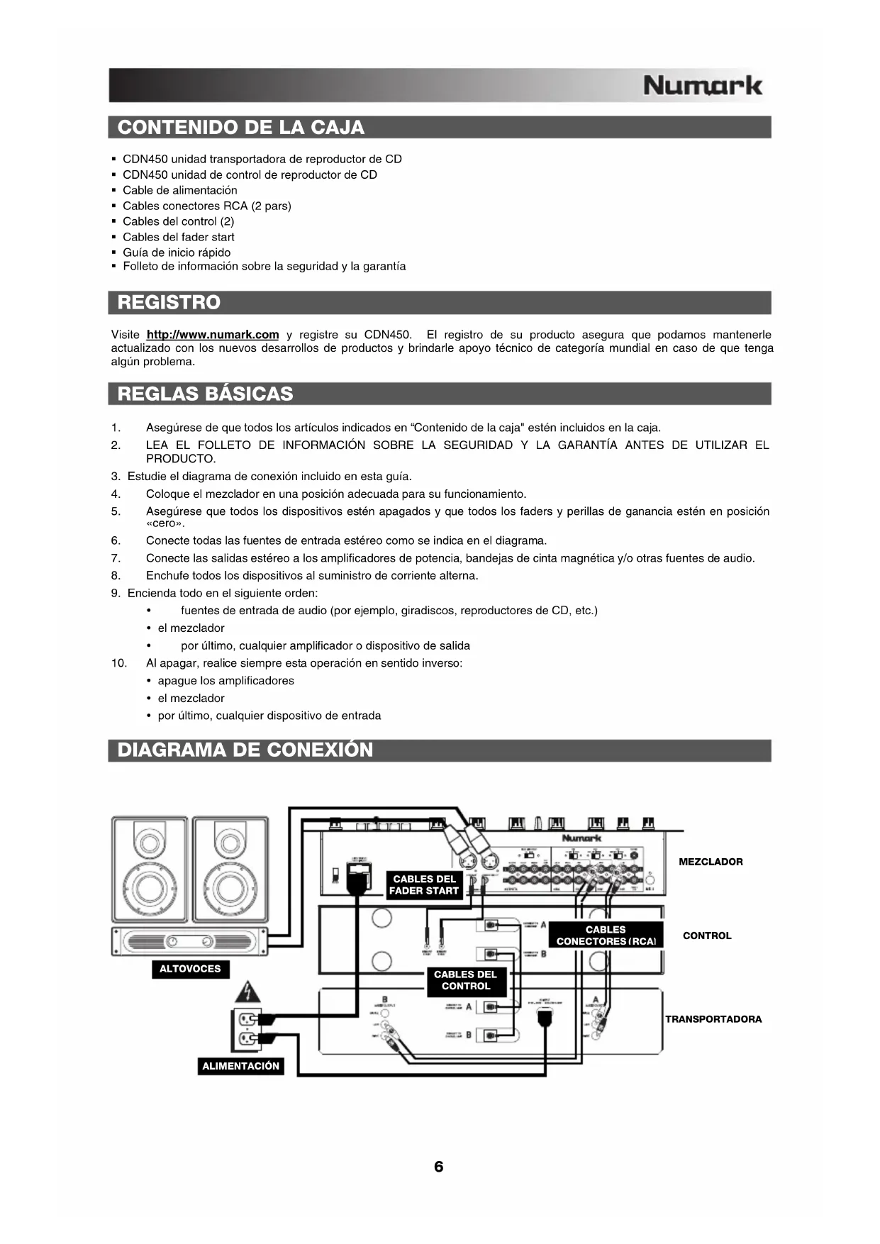 CDN450 unidad transportadora de reproductor de CD CDN450 unidad de control de reproductor de CD Cable de alimentación Cables conectores RCA (2 pars) Cables del control (2) Cables del fader start Guía de inicio rápido Folleto de información sobre la seguridad y la garantía REGISTRO Visite http://www.numark.com y registre su CDN450. El registro de su producto asegura que podamos mantenerle actualizado con los nuevos desarrollos de productos y brindarle apoyo técnico de categoría mundial en caso de que tenga algún problema.
