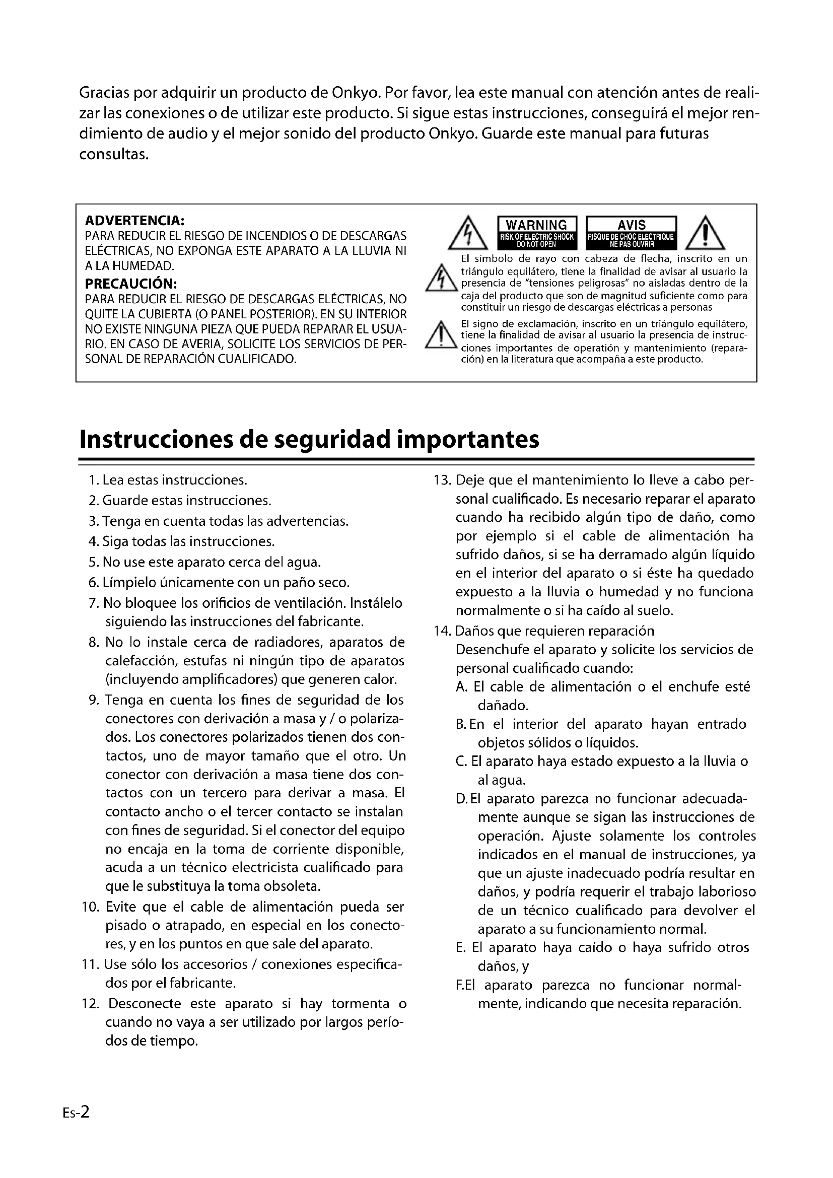 - En cas d’interférence avec une station de radio FM ou AM du tuner ou du récepteur, éloignez son antenne du RI Dock, de l’iPod et du cordon de l’adaptateur secteur. Evitez en outre de d’enrouler le cordon de l’adaptateur secteur avec d’autres câbles.Es-2 Gracias por adquirir un producto de Onkyo. Por favor, lea este manual con atención antes de reali- zar las conexiones o de utilizar este producto. Si sigue estas instrucciones, conseguirá el mejor ren- dimiento de audio y el mejor sonido del producto Onkyo. Guarde este manual para futuras consultas. Instrucciones de seguridad importantes