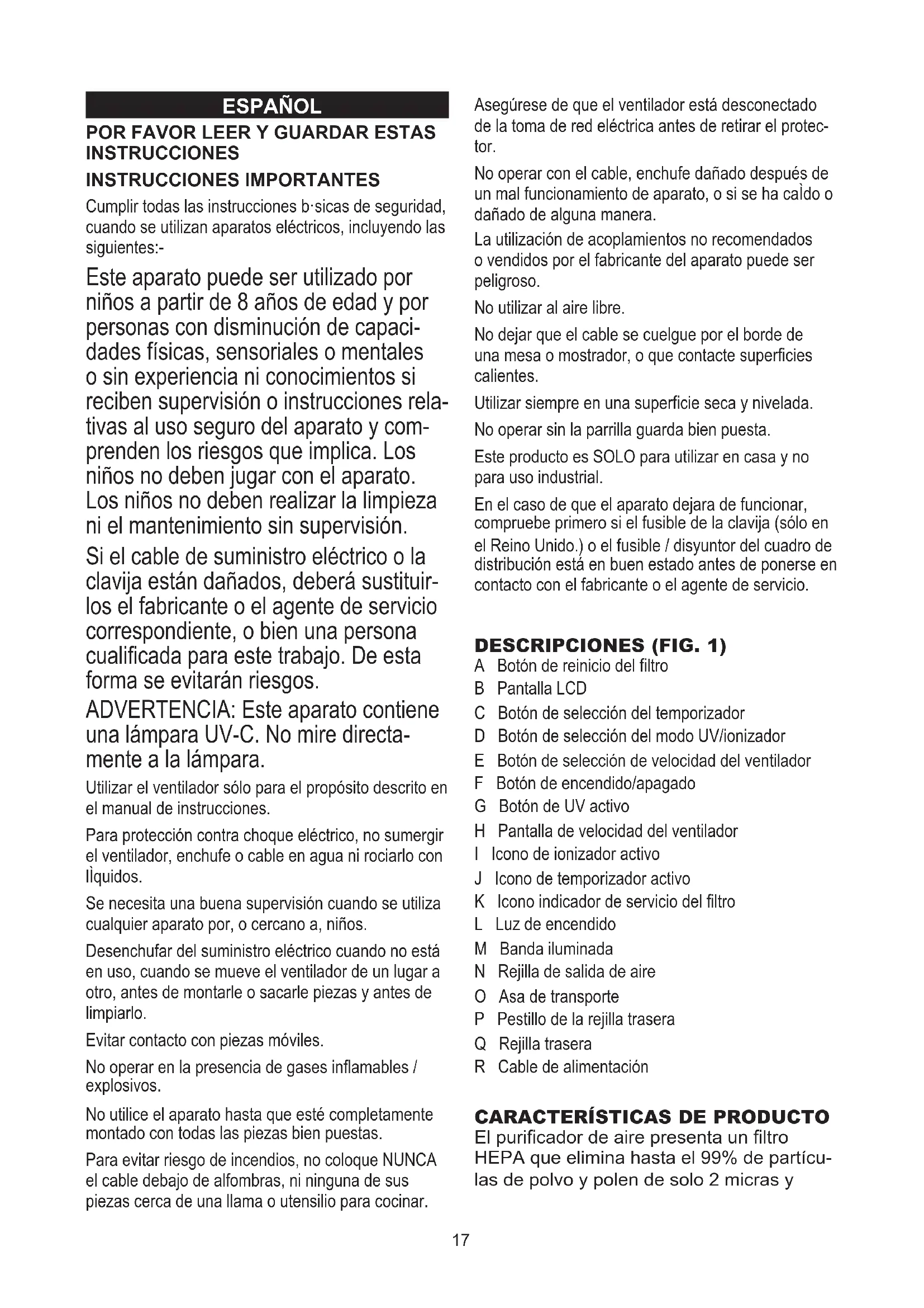 INSTRUCCIONES INSTRUCCIONES IMPORTANTES Cumplir todas las instrucciones b·sicas de seguridad, cuando se utilizan aparatos eléctricos, incluyendo las siguientes:- Este aparato puede ser utilizado por niños a partir de 8 años de edad y por personas con disminución de capaci- dades físicas, sensoriales o mentales o sin experiencia ni conocimientos si reciben supervisión o instrucciones rela- tivas al uso seguro del aparato y com- prenden los riesgos que implica. Los niños no deben jugar con el aparato. Los niños no deben realizar la limpieza ni el mantenimiento sin supervisión. Si el cable de suministro eléctrico o la clavija están dañados, deberá sustituir- los el fabricante o el agente de servicio correspondiente, o bien una persona cualicada para este trabajo. De esta forma se evitarán riesgos. ADVERTENCIA: Este aparato contiene una lámpara UV-C. No mire directa- mente a la lámpara. Utilizar el ventilador sólo para el propósito descrito en el manual de instrucciones. Para protección contra choque eléctrico, no sumergir el ventilador, enchufe o cable en agua ni rociarlo con lÌquidos. Se necesita una buena supervisión cuando se utiliza cualquier aparato por, o cercano a, niños. Desenchufar del suministro eléctrico cuando no está en uso, cuando se mueve el ventilador de un lugar a otro, antes de montarle o sacarle piezas y antes de limpiarlo. Evitar contacto con piezas móviles. No operar en la presencia de gases inamables / explosivos. No utilice el aparato hasta que esté completamente montado con todas las piezas bien puestas. Para evitar riesgo de incendios, no coloque NUNCA el cable debajo de alfombras, ni ninguna de sus piezas cerca de una llama o utensilio para cocinar. Asegúrese de que el ventilador está desconectado de la toma de red eléctrica antes de retirar el protec- tor. No operar con el cable, enchufe dañado después de un mal funcionamiento de aparato, o si se ha caÌdo o dañado de alguna manera. La utilización de acoplamientos no recomendados o vendidos por el fabricante del aparato puede ser peligroso. No utilizar al aire libre. No dejar que el cable se cuelgue por el borde de una mesa o mostrador, o que contacte supercies calientes. Utilizar siempre en una supercie seca y nivelada. No operar sin la parrilla guarda bien puesta. Este producto es SOLO para utilizar en casa y no para uso industrial. En el caso de que el aparato dejara de funcionar, compruebe primero si el fusible de la clavija (sólo en el Reino Unido.) o el fusible / disyuntor del cuadro de distribución está en buen estado antes de ponerse en contacto con el fabricante o el agente de servicio. DESCRIPCIONES (FIG. 1) A Botón de reinicio del ltro B Pantalla LCD C Botón de selección del temporizador D Botón de selección del modo UV/ionizador E Botón de selección de velocidad del ventilador F Botón de encendido/apagado G Botón de UV activo H Pantalla de velocidad del ventilador I Icono de ionizador activo J Icono de temporizador activo K Icono indicador de servicio del ltro L Luz de encendido M Banda iluminada N Rejilla de salida de aire O Asa de transporte P Pestillo de la rejilla trasera Q Rejilla trasera R Cable de alimentación
