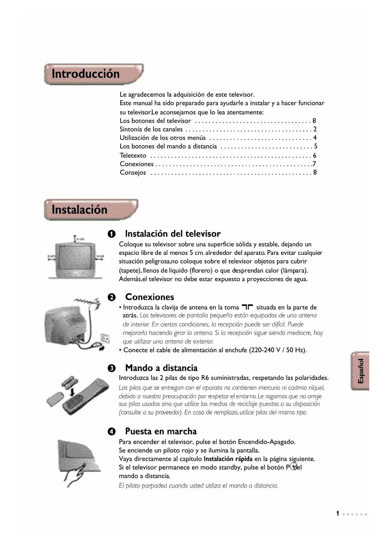 - Introducción Le agradecemos la adquisición de este televisor. Este manual ha sido preparado para ayudarle a instalar y a hacer funcionar su telev i s o r. Le aconsejamos que lo lea atentamente: Los botones del televisor p. 8