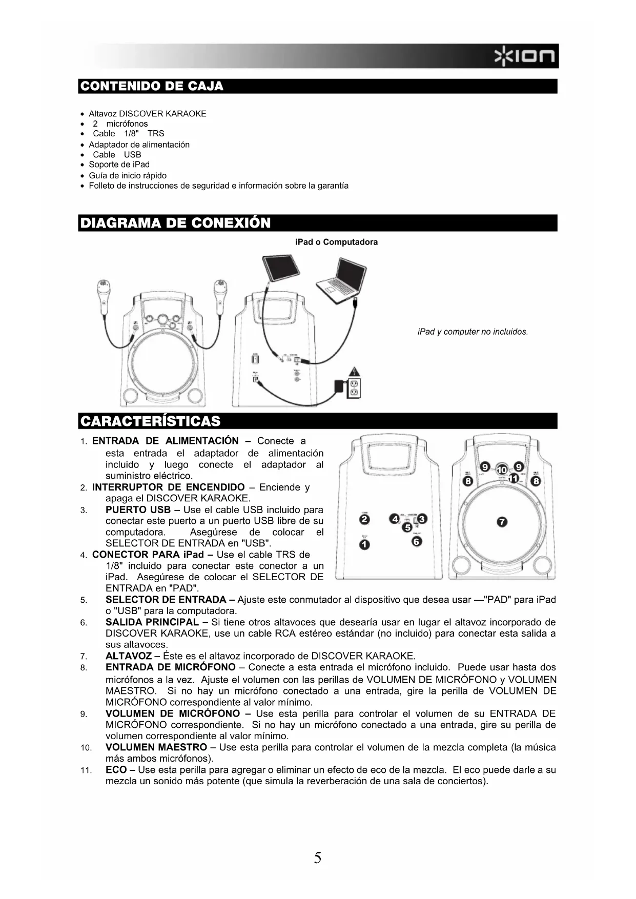 - Altavoz DISCOVER KARAOKE • 2 micrófonos • Cable 1/8" TRS • Adaptador de alimentación • Cable USB • Soporte de iPad • Guía de inicio rápido • Folleto de instrucciones de seguridad e información sobre la garantía