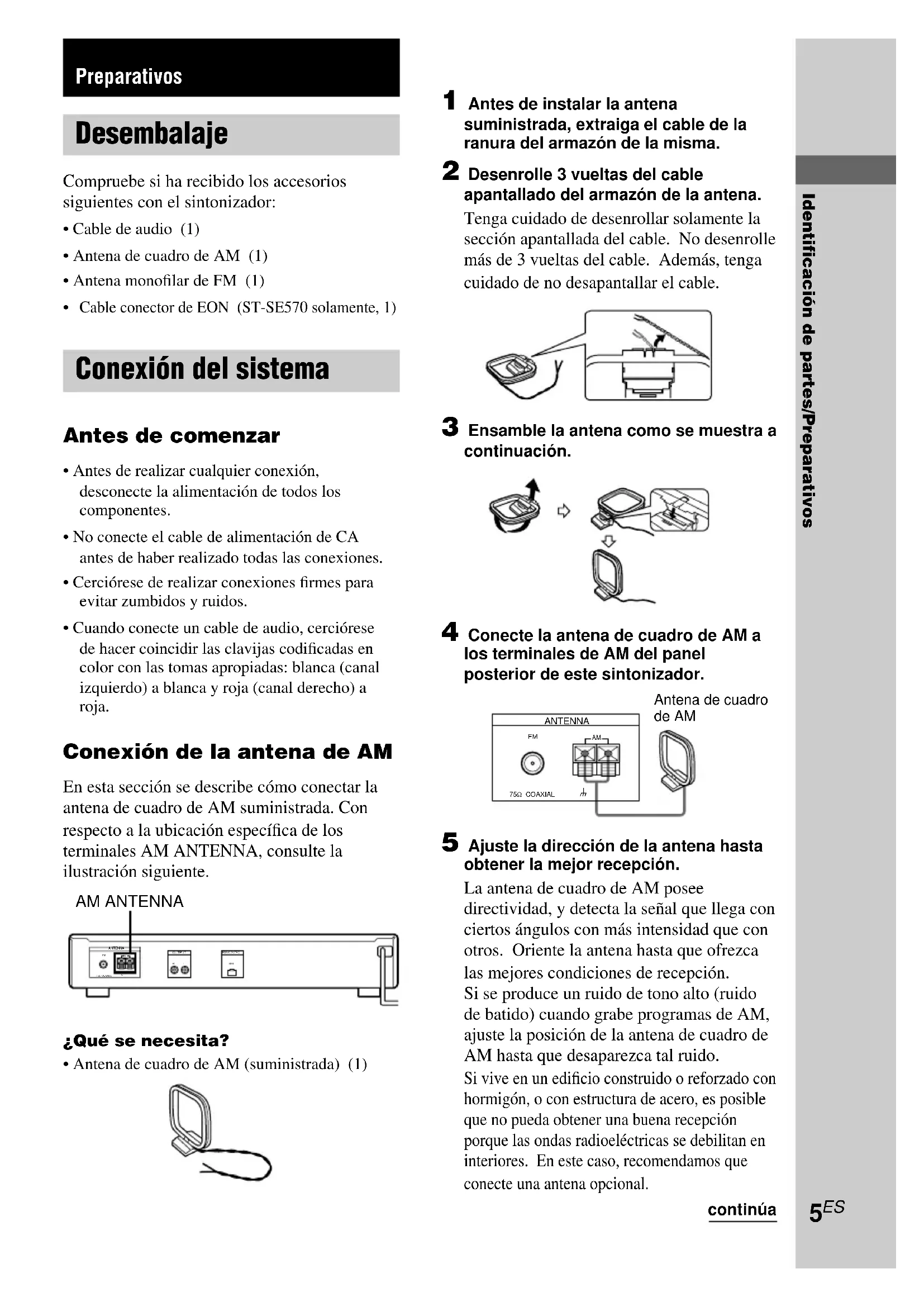 - Antes de realizar cualquier conexión,desconecte la alimentación de todos loscomponentes.• No conecte el cable de alimentación de CAantes de haber realizado todas las conexiones.• Cerciórese de realizar conexiones firmes paraevitar zumbidos y ruidos.• Cuando conecte un cable de audio, cercióresede hacer coincidir las clavijas codificadas encolor con las tomas apropiadas: blanca (canalizquierdo) a blanca y roja (canal derecho) aroja. Conexión de la antena de AM En esta sección se describe cómo conectar la antena de cuadro de AM suministrada. Con respecto a la ubicación específica de los terminales AM ANTENNA, consulte la ilustración siguiente. ¿Qué se necesita?• Antena de cuadro de AM (suministrada) (1) Preparativos 1 Antes de instalar la antena suministrada, extraiga el cable de laranura del armazón de la misma. 2 Desenrolle 3 vueltas del cable apantallado del armazón de la antena. Tenga cuidado de desenrollar solamente la sección apantallada del cable. No desenrolle más de 3 vueltas del cable. Además, tenga cuidado de no desapantallar el cable. 3 Ensamble la antena como se muestra a continuación. 4 Conecte la antena de cuadro de AM a los terminales de AM del panelposterior de este sintonizador. 5 Ajuste la dirección de la antena hasta obtener la mejor recepción. La antena de cuadro de AM posee directividad, y detecta la señal que llega con ciertos ángulos con más intensidad que con otros. Oriente la antena hasta que ofrezca las mejores condiciones de recepción. Si se produce un ruido de tono alto (ruido de batido) cuando grabe programas de AM, ajuste la posición de la antena de cuadro de AM hasta que desaparezca tal ruido. Si vive en un edificio construido o reforzado con hormigón, o con estructura de acero, es posible que no pueda obtener una buena recepción porque las ondas radioeléctricas se debilitan en interiores. En este caso, recomendamos que conecte una antena opcional. Antena de cuadrode AMcontinúaAM ANTENNAANTENNAOUTPUTEON CONTROL