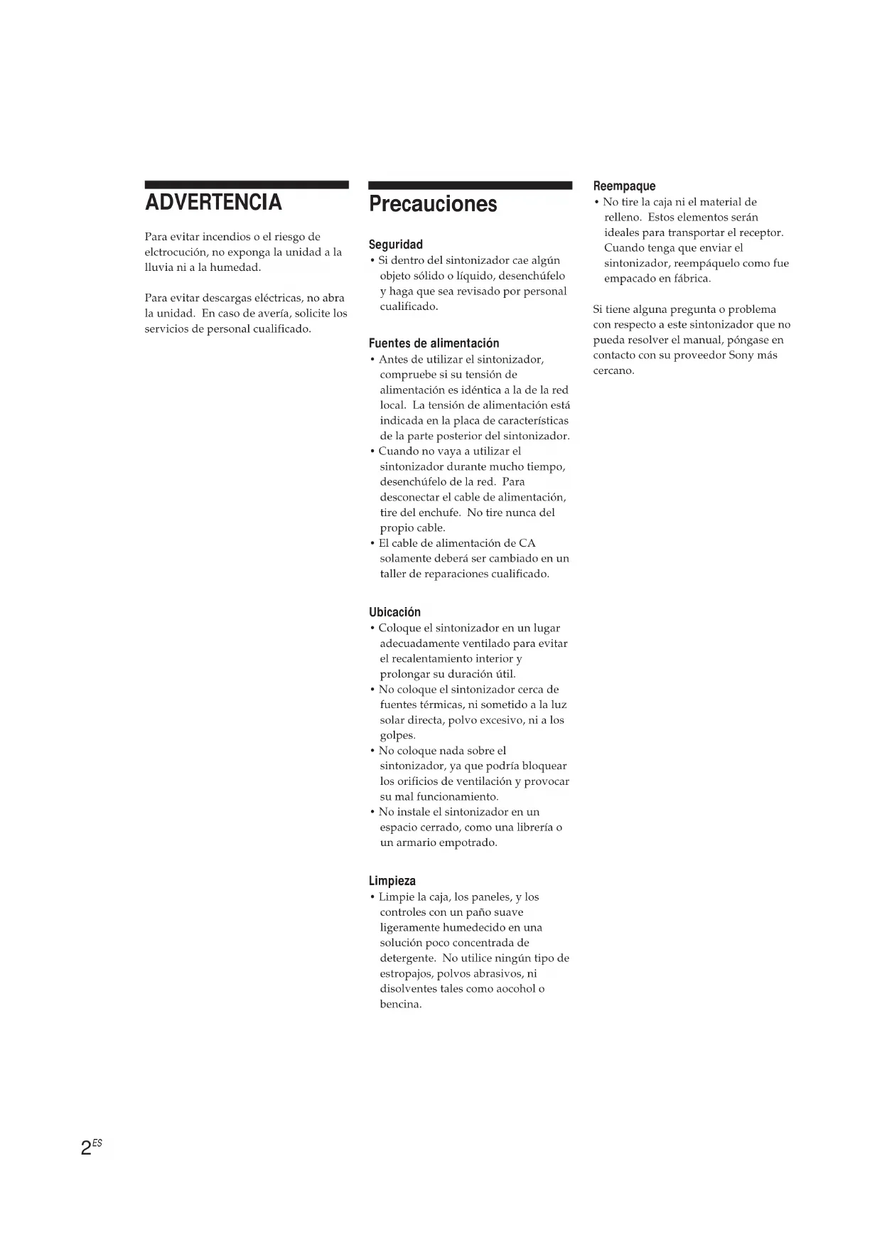 - Limpie la caja, los paneles, y los controles con un paño suave ligeramente humedecido en una solución poco concentrada de detergente. No utilice ningún tipo de estropajos, polvos abrasivos, ni disolventes tales como aocohol o bencina. ADVERTENCIA Para evitar incendios o el riesgo de elctrocución, no exponga la unidad a la lluvia ni a la humedad. Para evitar descargas eléctricas, no abra la unidad. En caso de avería, solicite los servicios de personal cualificado. Reempaque