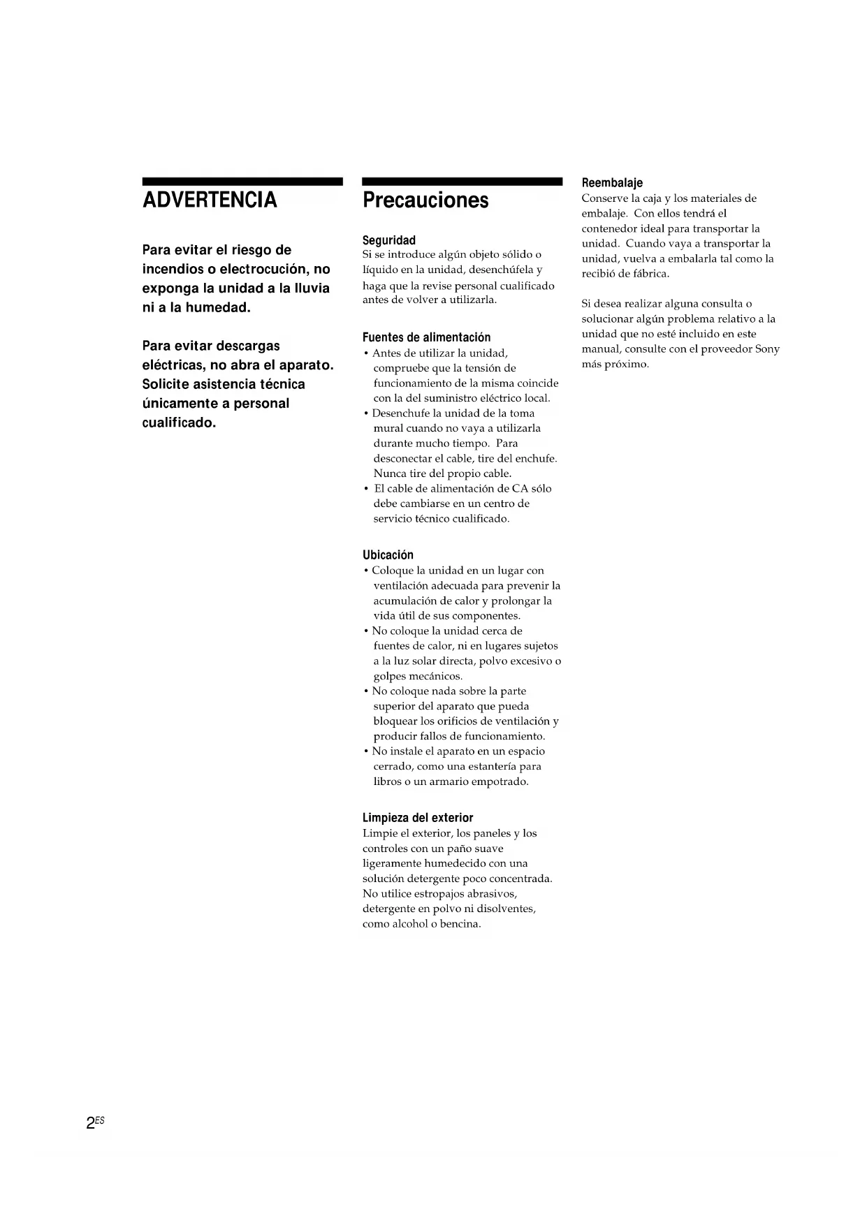 - No instale el aparato en un espacio cerrado, como una estantería para libros o un armario empotrado. Limpieza del exterior Limpie el exterior, los paneles y los controles con un paño suave ligeramente humedecido con una solución detergente poco concentrada. No utilice estropajos abrasivos, detergente en polvo ni disolventes, como alcohol o bencina. Reembalaje Conserve la caja y los materiales de embalaje. Con ellos tendrá el contenedor ideal para transportar la unidad. Cuando vaya a transportar la unidad, vuelva a embalarla tal como la recibió de fábrica. Si desea realizar alguna consulta o solucionar algún problema relativo a la unidad que no esté incluido en este manual, consulte con el proveedor Sony más próximo.3