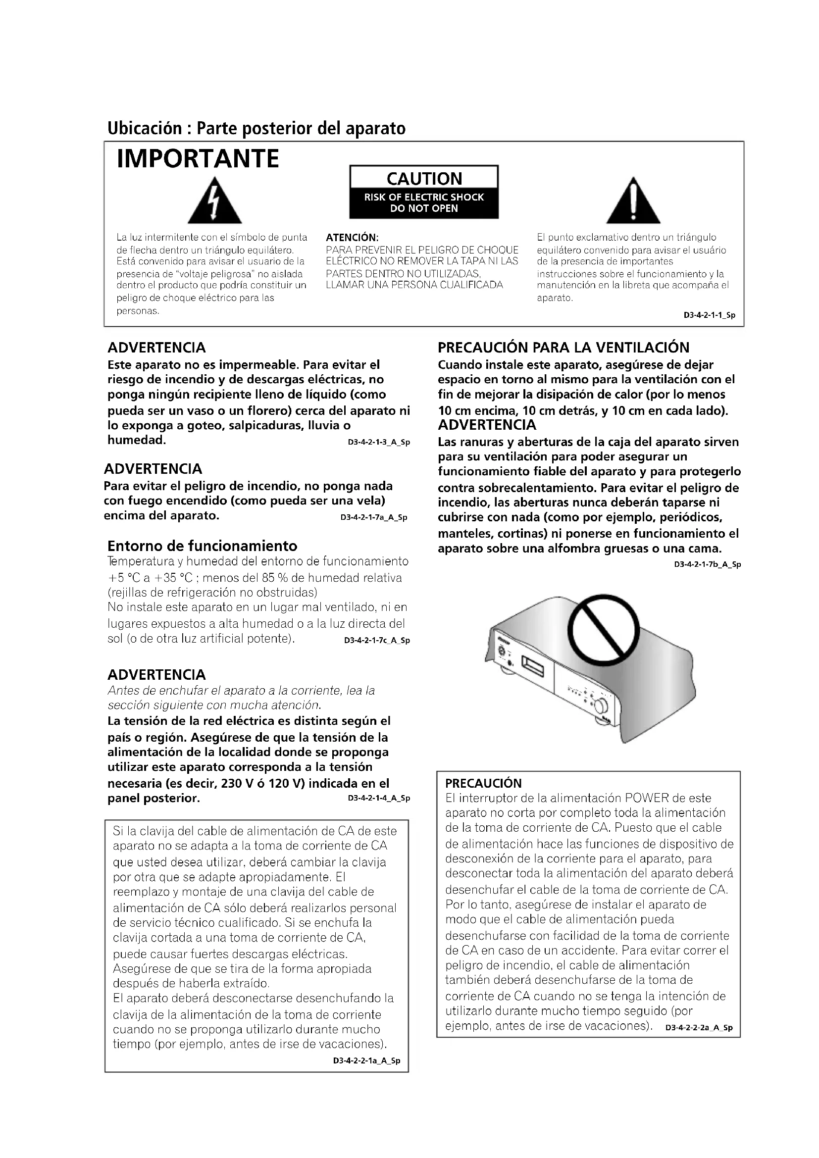 Cuando instale este aparato, asegúrese de dejar espacio en torno al mismo para la ventilación con el fin de mejorar la disipación de calor (por lo menos 10 cm encima, 10 cm detrás, y 10 cm en cada lado). ADVERTENCIA Las ranuras y aberturas de la caja del aparato sirven para su ventilación para poder asegurar un funcionamiento fiable del aparato y para protegerlo contra sobrecalentamiento. Para evitar el peligro de incendio, las aberturas nunca deberán taparse ni cubrirse con nada (como por ejemplo, periódicos, manteles, cortinas) ni ponerse en funcionamiento el aparato sobre una alfombra gruesas o una cama. D3-4-2-1-7b_A_Sp ADVERTENCIA La tensión de la red eléctrica es distinta según el país o región. Asegúrese de que la tensión de la alimentación de la localidad donde se proponga utilizar este aparato corresponda a la tensión necesaria (es decir, 230 V ó 120 V) indicada en el panel posterior. D3-4-2-1-4_A_Sp Antes de enchufar el aparato a la corriente, lea la sección siguiente con mucha atención. Si la clavija del cable de alimentación de CA de este aparato no se adapta a la toma de corriente de CA que usted desea utilizar, deberá cambiar la clavija por otra que se adapte apropiadamente. El reemplazo y montaje de una clavija del cable de alimentación de CA sólo deberá realizarlos personal de servicio técnico cualificado. Si se enchufa la clavija cortada a una toma de corriente de CA, puede causar fuertes descargas eléctricas. Asegúrese de que se tira de la forma apropiada después de haberla extraído. El aparato deberá desconectarse desenchufando la clavija de la alimentación de la toma de corriente cuando no se proponga utilizarlo durante mucho tiempo (por ejemplo, antes de irse de vacaciones). D3-4-2-2-1a_A_Sp PRECAUCIÓN El interruptor de la alimentación POWER de este aparato no corta por completo toda la alimentación de la toma de corriente de CA. Puesto que el cable de alimentación hace las funciones de dispositivo de desconexión de la corriente para el aparato, para desconectar toda la alimentación del aparato deberá desenchufar el cable de la toma de corriente de CA. Por lo tanto, asegúrese de instalar el aparato de modo que el cable de alimentación pueda desenchufarse con facilidad de la toma de corriente de CA en caso de un accidente. Para evitar correr el peligro de incendio, el cable de alimentación también deberá desenchufarse de la toma de corriente de CA cuando no se tenga la intención de utilizarlo durante mucho tiempo seguido (por ejemplo, antes de irse de vacaciones). D3-4-2-2-2a_A_Sp