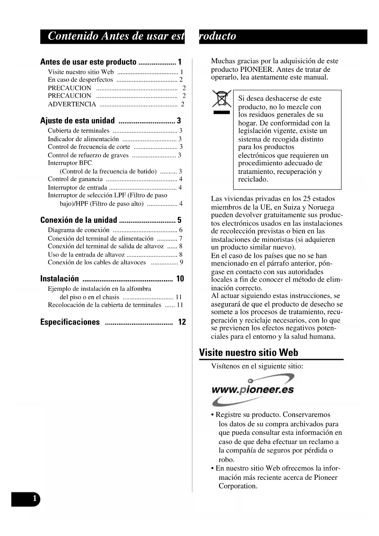 - The average current drawn is nearly the maximum current drawn by this unit when an audio signal is input. Use this value when working out total current drawn by multiple power amplifiers.1 Antes de usar este producto .................... 1 Visite nuestro sitio Web .................................... 1 En caso de desperfectos .................................... 2 PRECAUCION ................................................ 2 PRECAUCION ................................................ 2 ADVERTENCIA .............................................. 2 Ajuste de esta unidad .............................. 3 Cubierta de terminales ...................................... 3 Indicador de alimentación ................................ 3 Control de frecuencia de corte .......................... 3 Control de refuerzo de graves .......................... 3 Interruptor BFC (Control de la frecuencia de batido) .......... 3 Control de ganancia .......................................... 4 Interruptor de entrada ........................................ 4 Interruptor de selección LPF (Filtro de paso bajo)/HPF (Filtro de paso alto) .................. 4 Conexión de la unidad .............................. 5 Diagrama de conexión ...................................... 6 Conexión del terminal de alimentación ............ 7 Conexión del terminal de salida de altavoz ...... 8 Uso de la entrada de altavoz .............................. 8 Conexión de los cables de altavoces ................ 9 Instalación ................................................ 10 Ejemplo de instalación en la alfombra del piso o en el chasis .............................. 11 Recolocación de la cubierta de terminales ...... 11 Especificaciones .................................... 12 Muchas gracias por la adquisición de este producto PIONEER. Antes de tratar de operarlo, lea atentamente este manual. Las viviendas privadas en los 25 estados miembros de la UE, en Suiza y Noruega pueden devolver gratuitamente sus produc- tos electrónicos usados en las instalaciones de recolección previstas o bien en las instalaciones de minoristas (si adquieren un producto similar nuevo). En el caso de los países que no se han mencionado en el párrafo anterior, pón- gase en contacto con sus autoridades locales a fin de conocer el método de elim- inación correcto. Al actuar siguiendo estas instrucciones, se asegurará de que el producto de desecho se somete a los procesos de tratamiento, recu- peración y reciclaje necesarios, con lo que se previenen los efectos negativos poten- ciales para el entorno y la salud humana. Visite nuestro sitio Web Visítenos en el siguiente sitio: