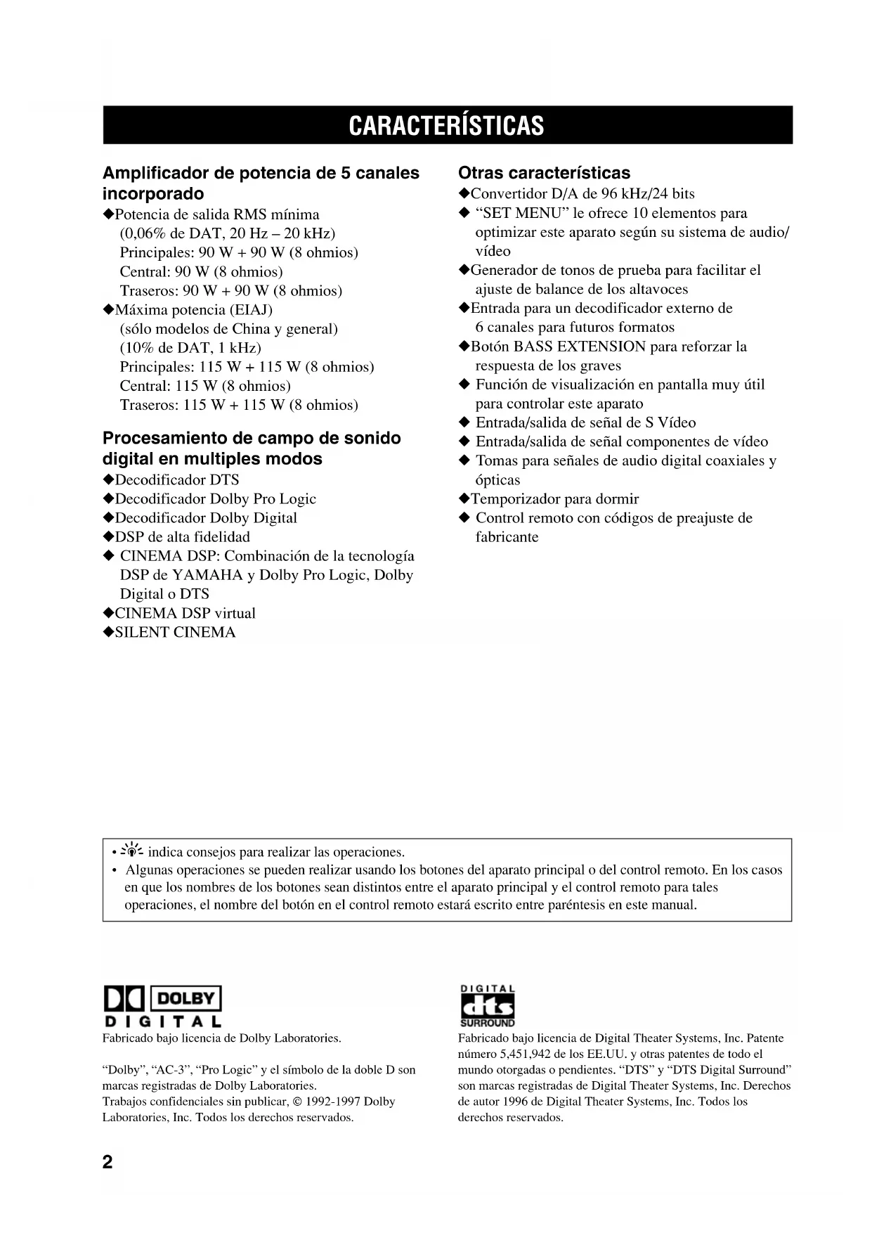 ESPECIFICACIONES ............................................ 59 GLOSARIO .............................................................. 60 ÍNDICE ..................................................................... 62 0602AX620(GB)_1-10_SP 1/24/1, 2:42 PM12 Amplificador de potencia de 5 canales incorporado ◆ Potencia de salida RMS mínima (0,06% de DAT, 20 Hz – 20 kHz) Principales: 90 W + 90 W (8 ohmios) Central: 90 W (8 ohmios) Traseros: 90 W + 90 W (8 ohmios) ◆ Máxima potencia (EIAJ) (sólo modelos de China y general) (10% de DAT, 1 kHz) Principales: 115 W + 115 W (8 ohmios) Central: 115 W (8 ohmios) Traseros: 115 W + 115 W (8 ohmios) Procesamiento de campo de sonido digital en multiples modos ◆ Decodificador DTS ◆ Decodificador Dolby Pro Logic ◆ Decodificador Dolby Digital ◆ DSP de alta fidelidad ◆ CINEMA DSP: Combinación de la tecnología DSP de YAMAHA y Dolby Pro Logic, Dolby Digital o DTS ◆ CINEMA DSP virtual ◆ SILENT CINEMA Otras características ◆ Convertidor D/A de 96 kHz/24 bits ◆ “SET MENU” le ofrece 10 elementos para optimizar este aparato según su sistema de audio/ vídeo ◆ Generador de tonos de prueba para facilitar el ajuste de balance de los altavoces ◆ Entrada para un decodificador externo de 6 canales para futuros formatos ◆ Botón BASS EXTENSION para reforzar la respuesta de los graves ◆ Función de visualización en pantalla muy útil para controlar este aparato ◆ Entrada/salida de señal de S Vídeo ◆ Entrada/salida de señal componentes de vídeo ◆ Tomas para señales de audio digital coaxiales y ópticas ◆ Temporizador para dormir ◆ Control remoto con códigos de preajuste de fabricante CARACTERÍSTICAS Fabricado bajo licencia de Dolby Laboratories. “Dolby”, “AC-3”, “Pro Logic” y el símbolo de la doble D son marcas registradas de Dolby Laboratories.Trabajos confidenciales sin publicar, © 1992-1997 DolbyLaboratories, Inc. Todos los derechos reservados.Fabricado bajo licencia de Digital Theater Systems, Inc. Patentenúmero 5,451,942 de los EE.UU. y otras patentes de todo el mundo otorgadas o pendientes. “DTS” y “DTS Digital Surround” son marcas registradas de Digital Theater Systems, Inc. Derechosde autor 1996 de Digital Theater Systems, Inc. Todos losderechos reservados.