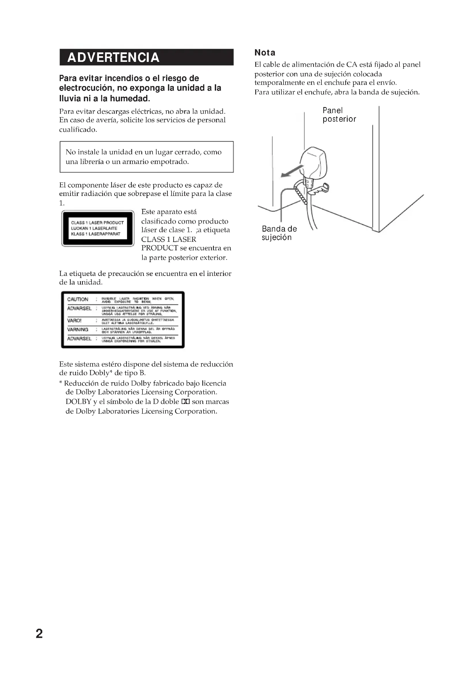 CAUTION : INVISIBLE LASER PADITION WHEN OPEN, AVOID EXPOSURE TO BEAM. ADVARSEL : USYNLIG LASERSTRALING VTD ÄRNING NÄR SMOKERSHESATRIVIDENER ER UDE AT FUNKTION, UNOGÅ UDG. ATTTELSE FOR STRÄLEN. VARO! : AMITTAESSA JA SUJALUNTUS OHITETTAESSA CLET ALTINA LASERSTATEVELLE. VARNING : LASERSTRALING NÄR DENNA DEL AR OPPNÅD OCH SPAINVEN AN UNOXIPPLAD. ADVARSEL : USYNLIG LASERSTRALING NÄR DEKSEL APNES UNOGÅ EKSPONERING FOR STRALEN.Este sistema estéro dispone del sistema de reducción de ruido Dobly* de tipo B.