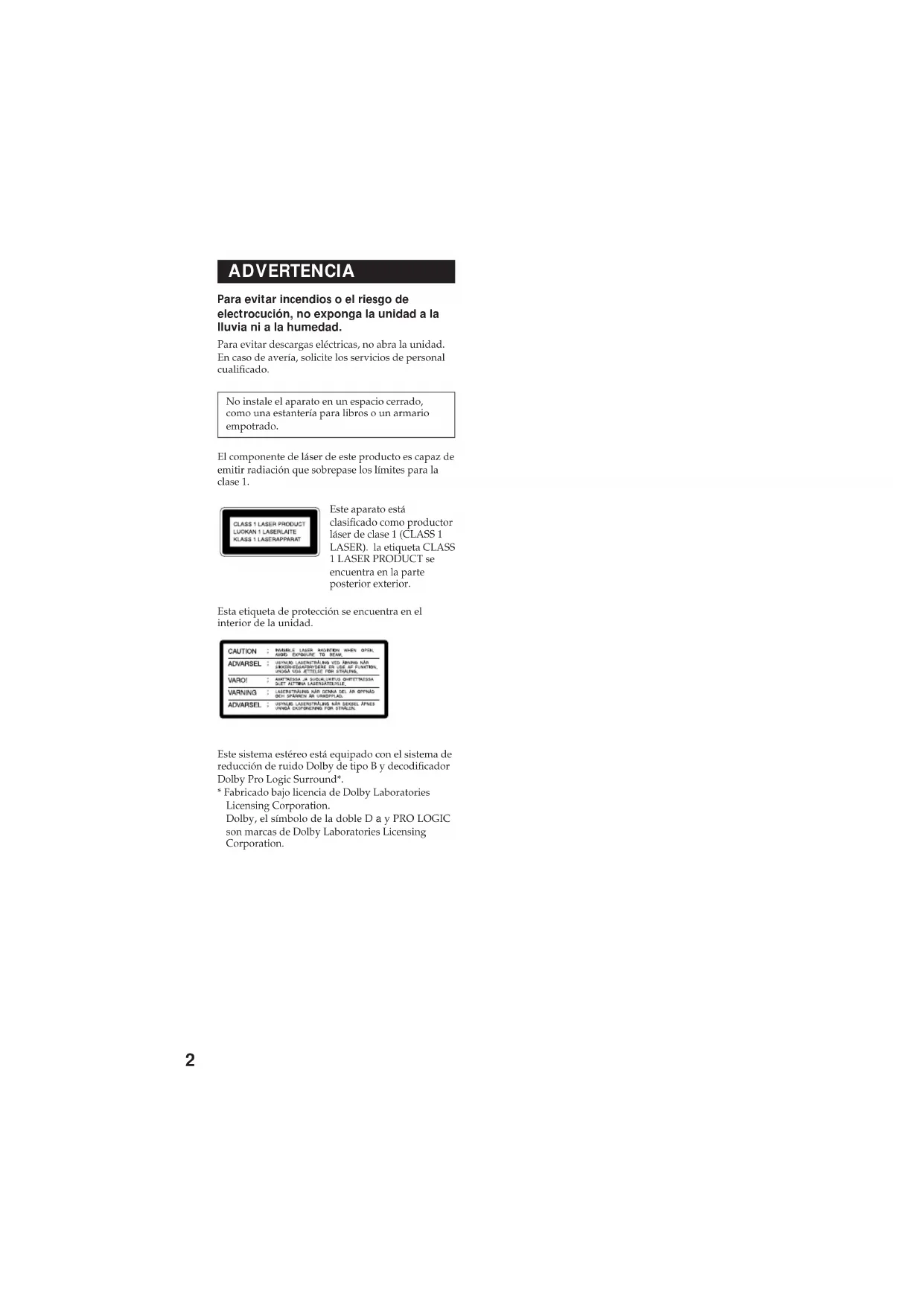 Para evaporar incendios o el riesgo de electrocución, no exponga la unidad a la lluvia ni a la humedad.