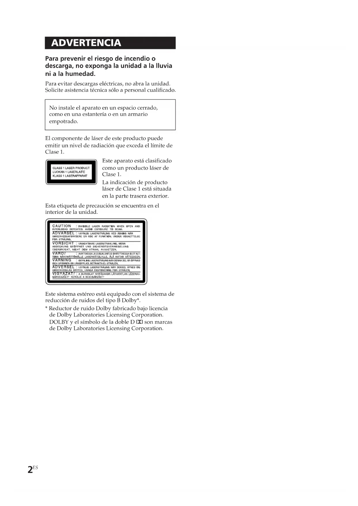 ADVERTENCIA Para prevenir el riesgo de incendio o descarga, no exponga la unidad a la lluvia ni a la humedad. Para evitar descargas eléctricas, no abra la unidad. Solicite asistencia técnica sólo a personal cualificado. No instale el aparato en un espacio cerrado, como en una estantería o en un armario empotrado. El componente de láser de este producto puede emitir un nivel de radiación que exceda el límite de Clase 1. Esta etiqueta de precaución se encuentra en el interior de la unidad. Este sistema estéreo está equipado con el sistema de reducción de ruidos del tipo B Dolby*.