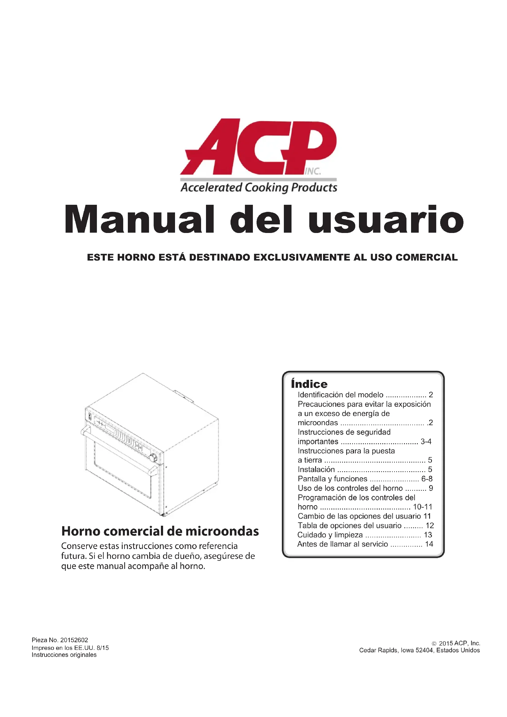 EXPOSICIÓN A UN EXCESO DE ENERGÍA DE MICROONDAS A. NO intente operar este horno con la puerta abierta ya que su uso con la puerta abierta puede causar una exposición nociva a la energía de microondas. Es importante no anular o modicarlos bloqueos de seguridad integrados. B. NO coloque ningún objeto entre la parte frontal del horno y la puerta, ni permita que se acumulen desperdicios o residuos de limpiador en las supercies de sellado. C. NO opere el horno si se ha dañado. Es particularmente importante que la puerta del horno se cierre adecuadamente y que no presente daños en:1. la puerta (doblada)2. bisagras y cierres (rotos o ojos)3. sellos de puertas y supercies de selladoD. El horno no debe ser ajustado o reparado por nadie salvo personal de servicio debidamentecalicado.Pieza No. 20152602 Impreso en los EE.UU. 8/15 Instrucciones originales 2015 ACP, Inc.Cedar Rapids, Iowa 52404, Estados Unidos3
