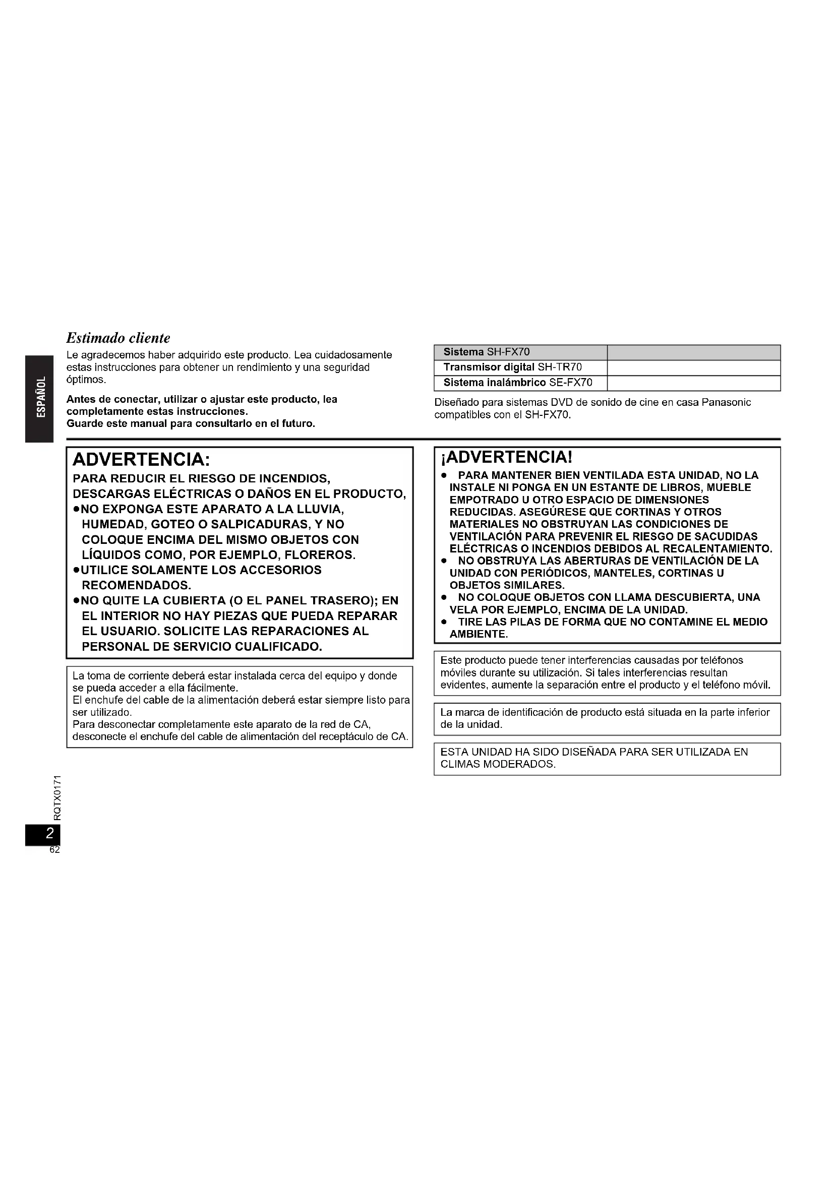 RQTX0171 ESPAÑOL Estimado cliente Le agradecemos haber adquirido este producto. Lea cuidadosamente estas instrucciones para obtener un rendimiento y una seguridad óptimos.Antes de conectar, utilizar o ajustar este producto, lea completamente estas instrucciones.Guarde este manual para consultarlo en el futuro.Diseñado para sistemas DVD de sonido de cine en casa Panasonic compatibles con el SH-FX70.Sistema SH-FX70Transmisor digital SH-TR70Sistema inalámbrico SE-FX70 ADVERTENCIA: PARA REDUCIR EL RIESGO DE INCENDIOS, DESCARGAS ELÉCTRICAS O DAÑOS EN EL PRODUCTO, ≥NO EXPONGA ESTE APARATO A LA LLUVIA,