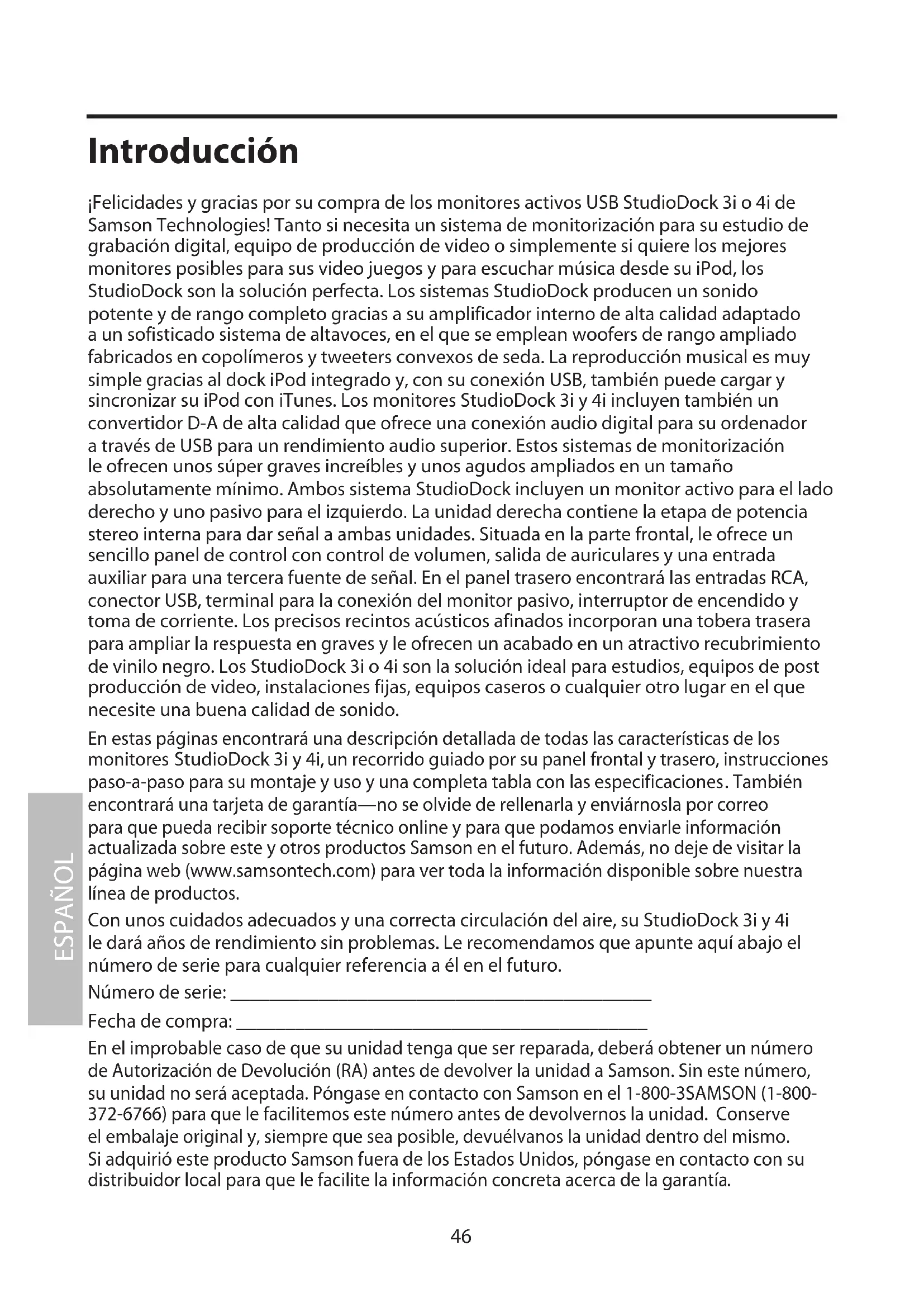 También encontrará una tarjeta de garantía—no se olvide de rellenarla y enviárnosla por correo para que pueda recibir soporte técnico online y para que podamos enviarle información actualizada sobre este y otros productos Samson en el futuro. Además, no deje de visitar la página web (www.samsontech.com) para ver toda la información disponible sobre nuestra línea de productos. Con unos cuidados adecuados y una correcta circulación del aire, su StudioDock 3i y 4i le dará años de rendimiento sin problemas. Le recomendamos que apunte aquí abajo el número de serie para cualquier referencia a él en el futuro. Número de serie: ___________________________________________ Fecha de compra: __________________________________________ En el improbable caso de que su unidad tenga que ser reparada, deberá obtener un número de Autorización de Devolución (RA) antes de devolver la unidad a Samson. Sin este número, su unidad no será aceptada. Póngase en contacto con Samson en el 1-800-3SAMSON (1-800- 372-6766) para que le facilitemos este número antes de devolvernos la unidad. Conserve el embalaje original y, siempre que sea posible, devuélvanos la unidad dentro del mismo. Si adquirió este producto Samson fuera de los Estados Unidos, póngase en contacto con su distribuidor local para que le facilite la información concreta acerca de la garantía