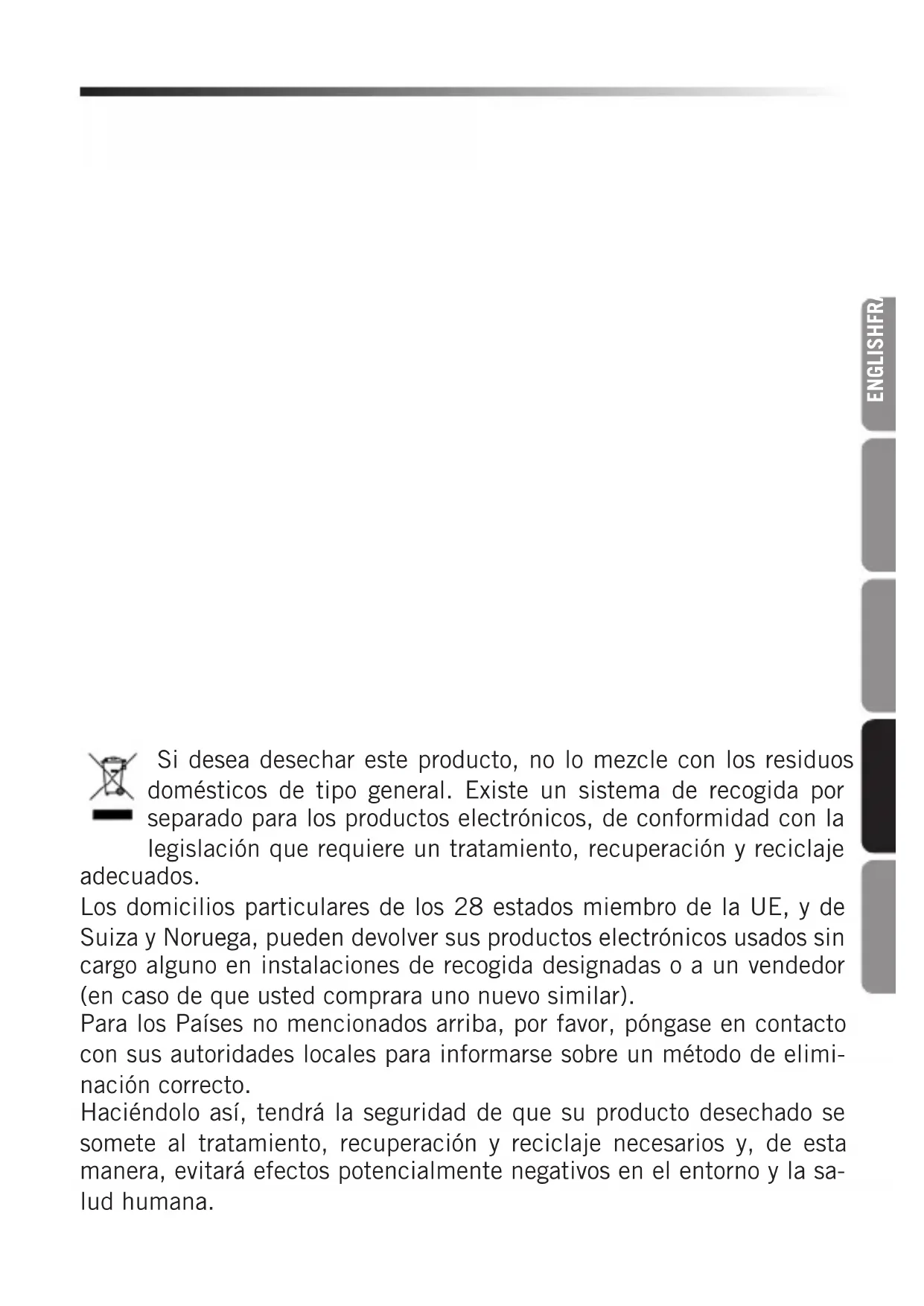 Si desea desechar este producto, no lo mezcle con los residuos domésticos de tipo general. Existe un sistema de recogida por separado para los productos electrónicos, de conformidad con la legislación que requiere un tratamiento, recuperación y reciclaje adecuados.