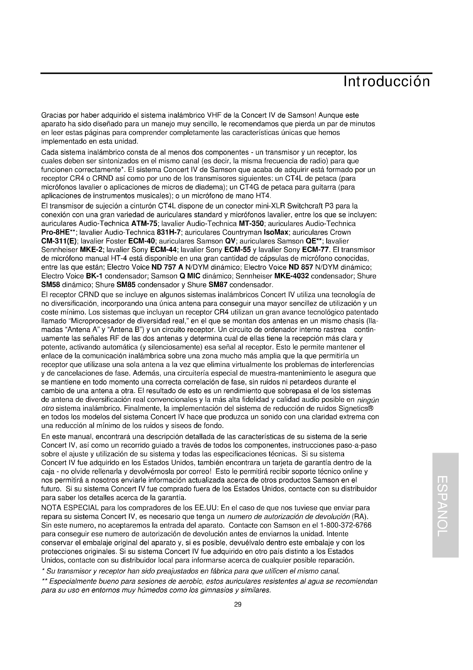 NOTA ESPECIAL para los compradores de los EE.UU: En el caso de que nos tuviese que enviar para repara su sistemas Concert IV, esnecessaryo queonga un numero de autorizacion de devolucion (RA). Sin este numero, no aceptaremos la entrada del aparato. Contacte con Samson en el 1-800-372-6766 para&#ngirse#n#do#r#tion #evolucion anesdeenviarnoslaunidad. Intente conservar el embalaje original del aparato y, si es possible, develuelvalo Dentro this embalaje y con los proteeciones originales. Si su systema Concert IV fue adquirido en otherpais distinto a los Estados Unidos, contacte con su distribuidor local para informarse acerca de qualquier possible reparacion.