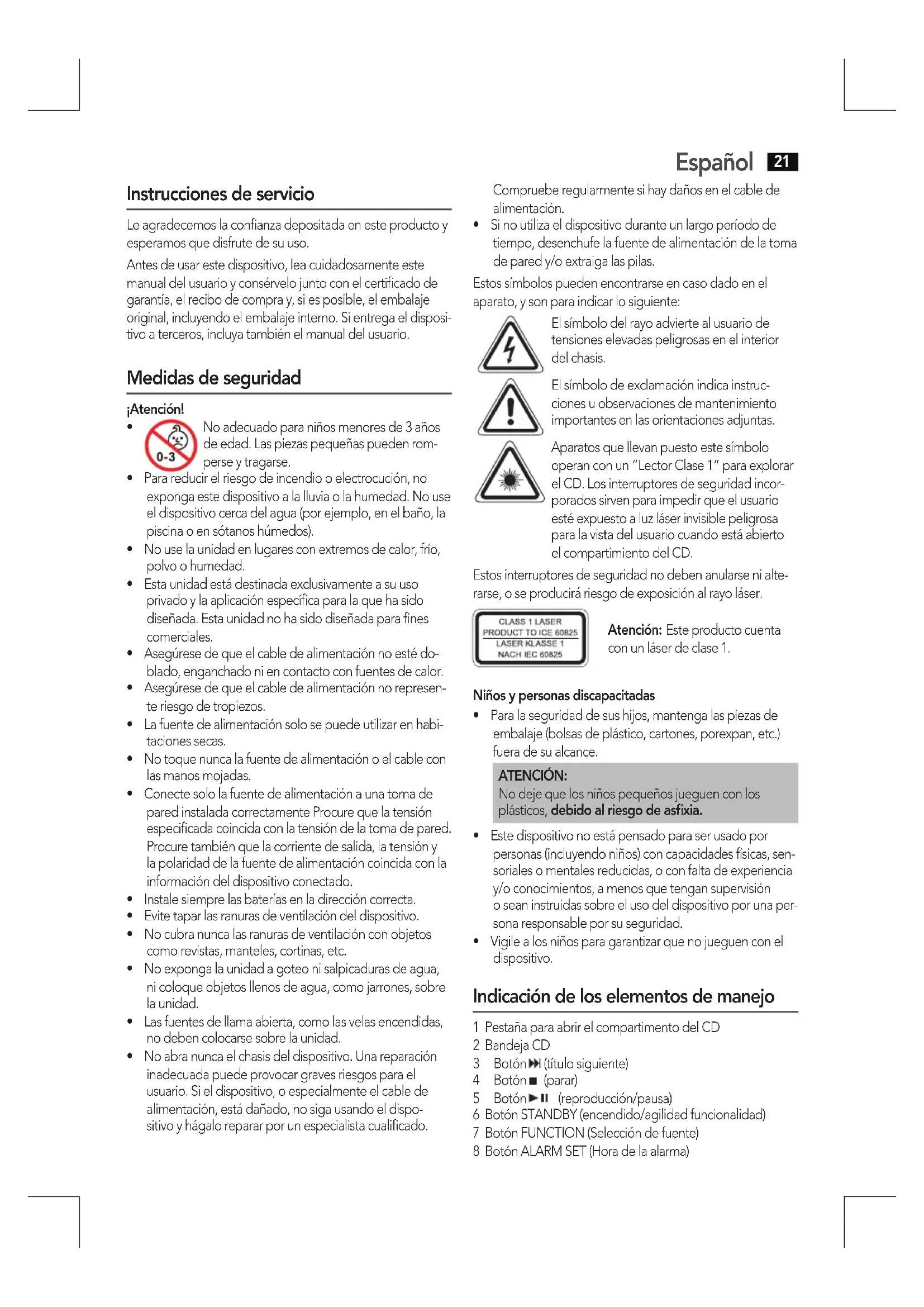 hora de la alarma. Cuando se ha alcanzado la hora predeterminada para la alarma, el dispositivo se enciende activando el modo de des- pertador seleccionado. El volumen aumenta gradualmente. NOTA: Si se ha insertado ningún CD, el dispositivo activará el timbre como modo de despertador. Desconexión de la señal de alarma Pulse el botón STANDBY (6) para desconectar la señal de alarma hasta el día siguiente. NOTA: La función de alarma se apagará automáticamente des- puésdeaprox.60minutos. Desactivar la función de alarma Pulse el botón ALARM SET (8) repetidamente hasta que los iconos “ ” y “ ” desaparezcan de la pantalla. Limpieza y conservación ATENCIÓN: No sumerja el dispositivo en agua.