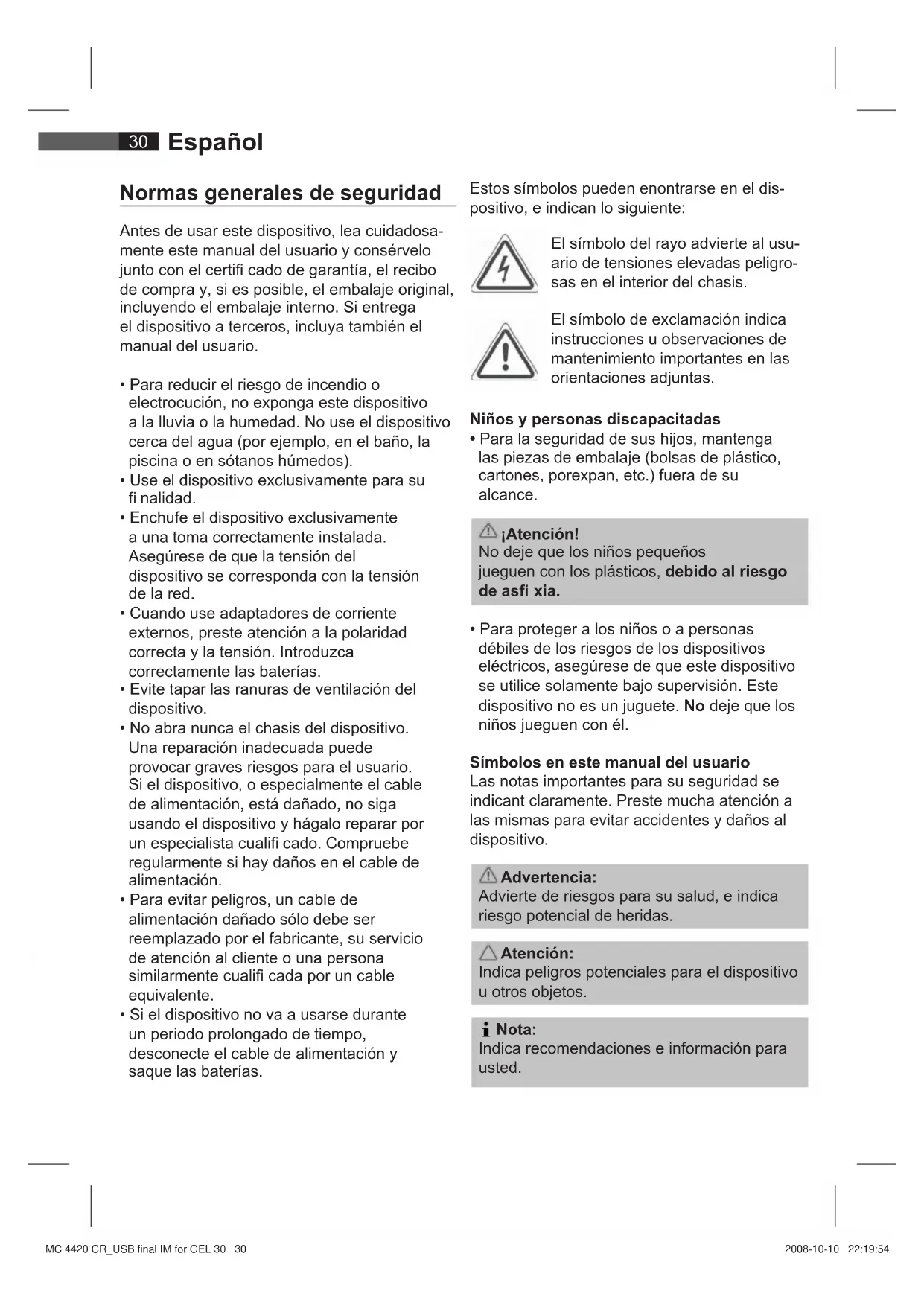 - Cierre el compartimiento de batería. Si el dispositivo no se usa durante un periodo prolongado de tiempo, saque las baterías Español MC 4420 CR_USB final IM for GEL 31 31MC 4420 CR_USB final IM for GEL 31 31 2008-10-10 22:19:552008-10-10 22:19:5532 del dispositivo para evitar fugas del ácido de baterías. Atención: Las baterías no son residuos domésticos. Lleve las baterías gastadas a puntos de recolección competentes o devuélvalas al vendedor. Advertencia: