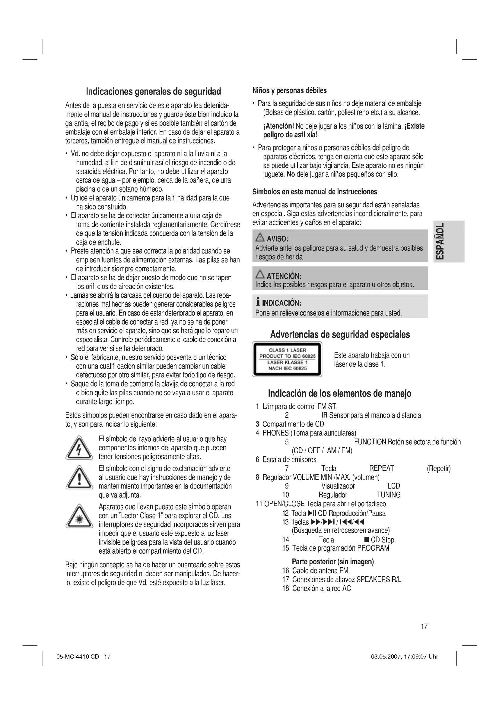 - Para proteger a niños o personas débiles del peligro de aparatos eléctricos, tenga en cuenta que este aparato sólo se puede utilizar bajo vigilancia. Este aparato no es ningún juguete. No deje jugar a niños pequeños con ello. Símbolos en este manual de instrucciones Advertencias importantes para su seguridad están señaladas en especial. Siga estas advertencias incondicionalmente, para evitar accidentes y daños en el aparato: AVISO: Advierte ante los peligros para su salud y demuestra posibles riesgos de herida. ATENCIÓN: Indica los posibles riesgos para el aparato u otros objetos. INDICACIÓN: Pone en relieve consejos e informaciones para usted. Advertencias de seguridad especiales Este aparato trabaja con un láser de la clase 1. Indicación de los elementos de manejo 1 Lámpara de control FM ST. 2 IR Sensor para el mando a distancia 3 Compartimento de CD 4 PHONES (Toma para auriculares) 5 FUNCTION Botón selectora de función (CD / OFF / AM / FM) 6 Escala de emisores 7 Tecla REPEAT (Repetir) 8 Regulador VOLUME MIN./MAX. (volumen) 9 Visualizador LCD 10 Regulador TUNING 11 OPEN/CLOSE Tecla para abrir el portadisco 12 Tecla II CD Reproducción/Pausa 13 Teclas /I / I/ (Búsqueda en retroceso/en avance) 14 Tecla CD Stop 15 Tecla de programación PROGRAM Parte posterior (sin imagen) 16 Cable de antena FM 17 Conexiones de altavoz SPEAKERS R/L 18 Conexión a la red AC 05-MC 4410 CD 17 03.05.2007, 17:09:07 Uhr18 ESPAÑOL ESPAÑOL Mando a distancia A Tecla II Reproducción/Pausa B Tecla STOP C Tecla INTRO D Tecla PROGRAM E Teclas I/ / /I SKIP/SEARCH (Búsqueda en retroceso/en avance) F Tecla REPEAT (Repetir) Puesta en servicio del aparato / Introducción