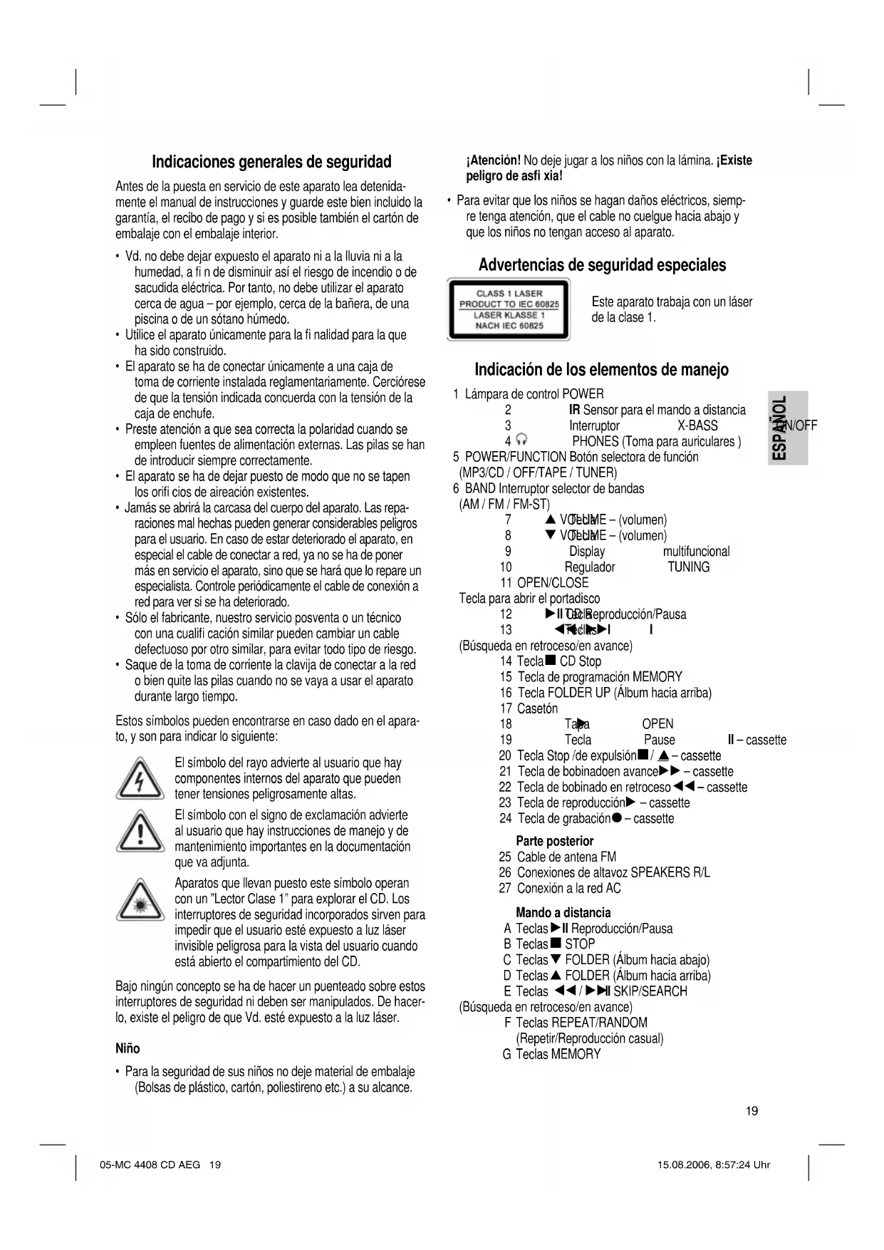 Aparatos que llevan,puesto este"simbolo operan con un "Lector Clase 1" para explorar el CD.Los interruptores de seguridad incorporedos sirven para impeder que el usuario este expuesto a luz láser invisible peligrosa para la vista del usuario cuando está abierto el compartmento del CD.