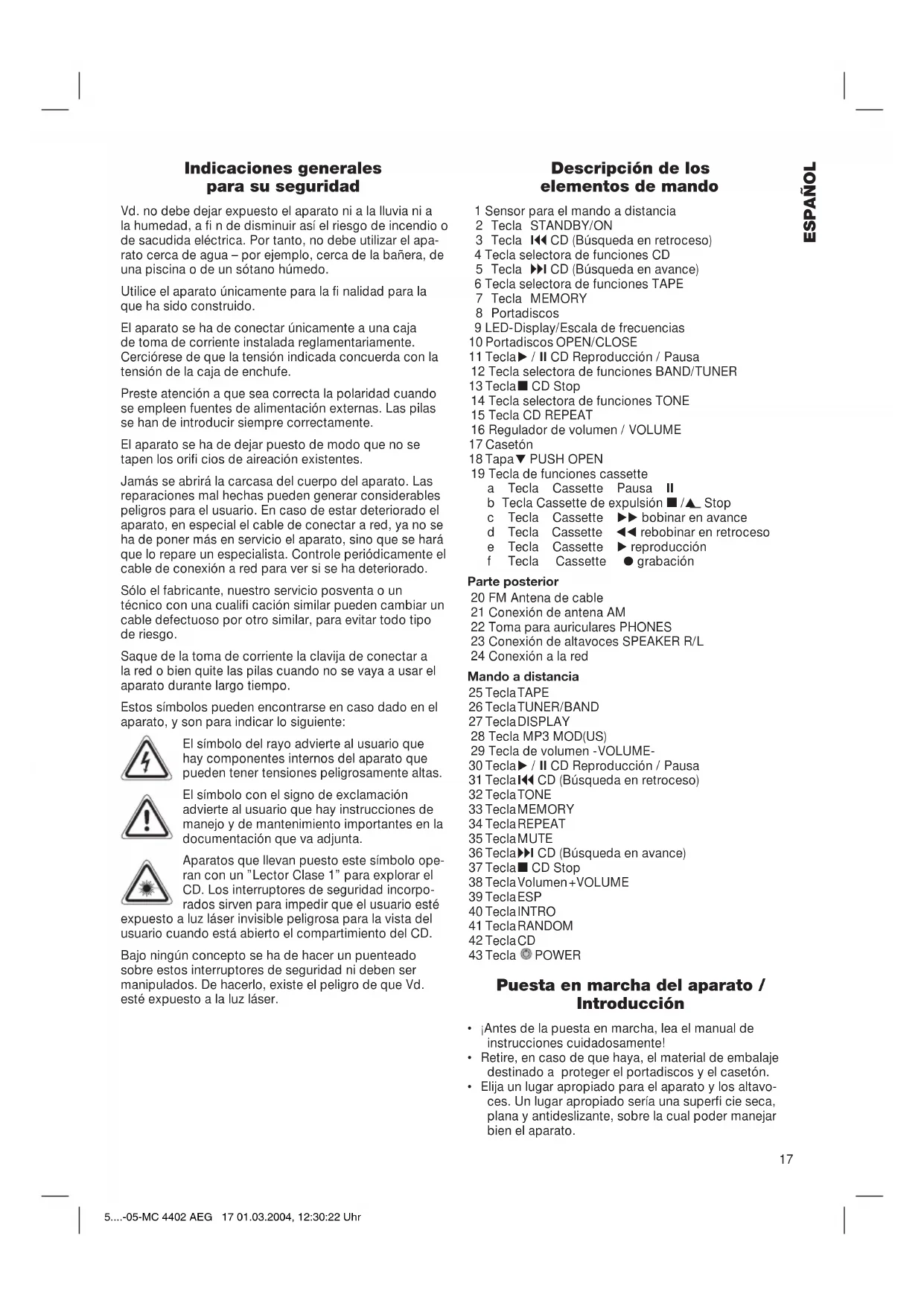 reproducción y se borrará el programa. Tiene la posibilidad de combinar los títulos programados con la función REPEAT. Después de haber programado los títulos y activado el aparato, presione por favor la tecla REPEAT hasta 3x y las funciones se podrán usar, como indicado en el apartado „REPEAT“. Descripción de las teclas del CD en el mando a distancia TAPE (25): Cambia al modo TAPE (parte de cas- sette). TUNER/ BAND (26): Cambia al modo RADIO. DISPLAY (27): Cuando se reproduzca un CD (no en el modo MP3) 1 x presionar: La duración de reproducción del título se hará cuenta atrás. 2 x presionar : La duración de reproducción del CD completo se hará cuenta atrás. 3 x presionar : El título actual y el tiempo reproducido se indicará en el display. MP3 MOD (28): Cambia al modo MP3. / II (30): El CD se inicia. Puede interrumpir brevemente la reproducción. Presione por favor de nuevo la tecla PLAY. La indicación en el display parpadea. I / I (31/36): Con estas teclas puede saltar al siguiente o al subsiguiente título etc.. Si mantiene la tecla presionada, se ini- ciará una búsqueda rápida de música. TONE (32): Vea bajo el punto “TONE”. MEMORY (33): Vea bajo el punto “Reproducción programada”. REPEAT (34): Vea bajo el punto “REPEAT”. MUTE (35): Sirve para la supresión rápida del volumen. Para suprimir esta función, presione de nuevo la tecla MUTE. Stop (37): El CD está parado. En el display par- padea la palabre “MUTE”. ESP (39): Deactiva / activa la función antichoque en caso de tener un disco compacto audio (no en el modo MP3). Presione STOP, accione hasta 2x la tecla ESP. En el display aparece ESP ON o OFF. En caso de haber perturbaciones los datos de música del CD serán leídos sin problemas de una memoria intermedia. Errores de lectura serán corregidos pos- teriormente en la memoria intermedia. INTRO (40): Reproduce los títulos de todos los CD´s por aprox. 10 segundos y salta a continuación al siguiente título (no en el modo MP3). RANDOM (41): Si presiona la tecla RANDOM, se repro- ducirán todos los títulos en una sucesión casual uno detrás de otro (no en el modo MP3). La indicación RANDOM en el display muestra la función. Si presiona de nuevo la tecla se suprimirán todas las funciones. El funcionamiento normal de reproducción continuará. CD (42): Cambia al modo CD. Funciones especiales CD´s – MP3 Con su aparato puede reproducir CD´s MP3. En es- tos discos se pueden grabar de forma comprimida hasta 200 títulos. Su aparato reconoce automáti- camente un disco compacto MP3. En el display se indicará MP3. De esta forma se mantendrá la calidad de sonido. Para reproducir estos discos se ruega proceder de la misma manera como indicado en el apartado reproducción de discos compactos. Este aparato se ha examinado según las normativas actuales y vigentes de la Comunidad Europea, como p.ej. compatibilidad electromagnética y directiva de baja tensión y se ha construido según las más nuevas especi- fi caciones en razón de la seguridad. No reservamos el derecho de efectuar modifi caciones técnicas. Garantía Para el aparato comercializado por nosotros nos respon- sabilizamos con una garantía de 24 meses a partir de la fecha de compra (factura de compra). Durante el período de garantía nos encargamos gratuíta- mente de los defectos del aparato y de los accesorios*), que se hayan originado por defectos del material o de la fabricación. Dependiendo de nuestra estimación se realizará una reparación o un cambio. ¡Los servicios de garantía no prolangan la garantía, ni se incia por ello un período nuevo de garantía! Como comprobante para la garantía es válido la factura de compra. Sin este comprobante no se podrá realizar un cambio o una reparación gratuíta. En el caso de garantía lleve el aparato base en el emba- laje original y la factura de compra a su concesionario. *) Defectos en las piezas de accesorio, no signifi can automáticamente el recambio gratuito del aparato completo. ¡En este caso dirijase por favor a nuestra linea de atención al cliente! ¡Rotos de vidrio o roturas en las piezas de plástico deben pagarse siempre por el cliente ! Defectos en los accesorios de uso o en las piezas de desgaste (p.ej. escobillas de carbón del motor, varillas amasadoras, correas de transmisión, mando a distancia de repuesto, cepillos de dientes de repuesto, hojas de sierra etc.), como también la limpieza, mantenimiento o el recambio de piezas de desgaste no recaen en la garantía e irán al cargo del cliente! En caso de intervención ajena se expira la garantía. Después de la garantía Después de haber expirado la garantía se pueden realizar las reparaciones por el concesionario o por el servicio de reparaciones. Los gastos irán al cargo del cliente. 5....-05-MC 4402 AEG 20 01.03.2004, 12:30:24 Uhr21 PORTUGUÊS Indicações gerais de segurança Para evitar o perigo de fogo ou de choque eléctrico não deverá colocar nunca o aparelho à chuva ou à humidade. Não se deverá pôr o aparelho a funcionar muito perto de água (por exemplo na casa de banho, na piscina ou numa cave humida). Utilize o aparelho só para o fi m previsto. Ligar só o aparelho a uma tomada de corrente devida- mente instalada. Faça atenção para que a tensão indica- da corresponda à tensão da tomada de corrente. No caso de se utilizarem partes externas da rede, deve-se fazer atenção à polari- dade e à tensão exacta. Colocar sempre a bateria do lado exacto. Colocar o aparelho de forma a que as aberturas de arejamento existentes não fi quem tapadas. Nunca se deve abrir a caixa do aparelho. Devido a con- sertos inadquados poderão resultar da’ grandes perigos para o utilizador do aparelho. No caso de estragos no aparelho, principalmente referentes ao cabo da rede, nunca se deverá voltar a pôr o aparelho a funcionar, mas sim mandar consertá-lo por um especialista. No que respeita a possivel estragos é aconselhável verifi c