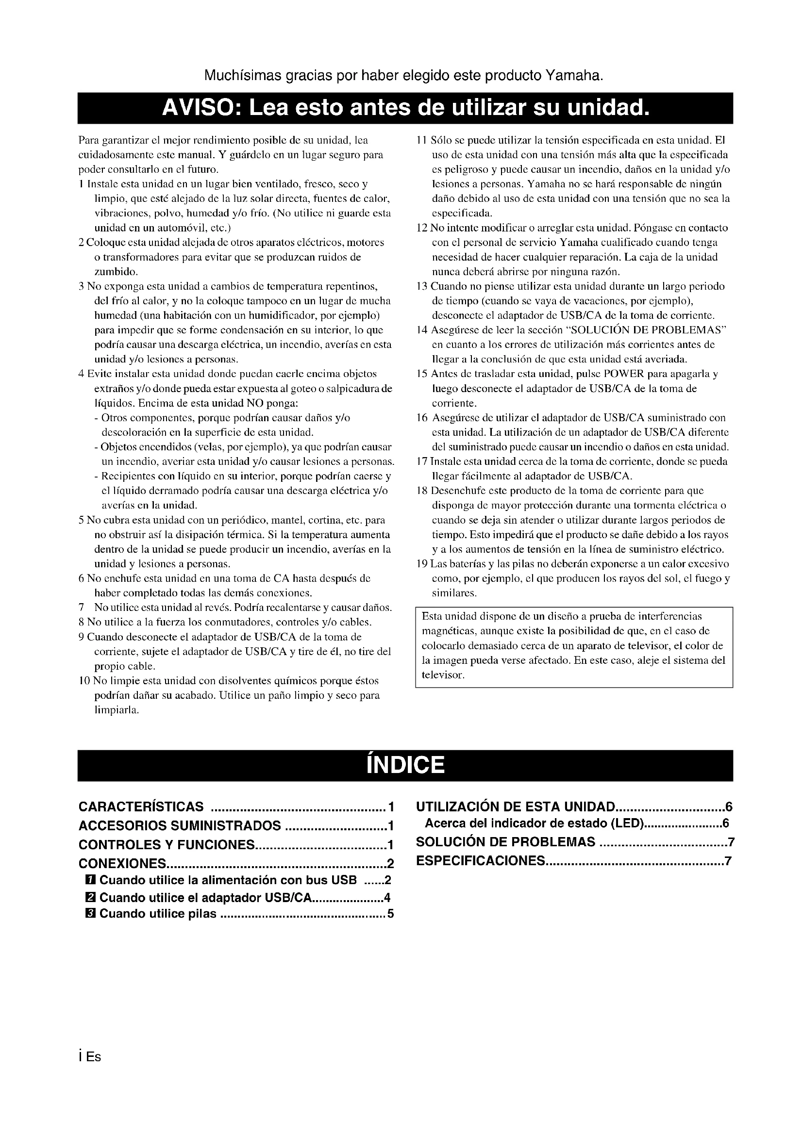 ESPECIFICACIONES.................................................7 AVISO: Lea esto antes de utilizar su unidad. Esta unidad dispone de un diseño a prueba de interferencias magnéticas, aunque existe la posibilidad de que, en el caso de colocarlo demasiado cerca de un aparato de televisor, el color de la imagen pueda verse afectado. En este caso, aleje el sistema del televisor. ÍNDICE1 Es Español ◆ 3 fuentes de alimentaciónSegún las circunstancias de utilización puede elegir una de tres fuentes de alimentación: Alimentación con bus USB, adaptador USB/CA o pilas.◆ Reproducción de sonido digitalLa conexión USB proporciona sonido claro con muy poco ruido.◆ Sonido estéreo realEl amplificador de alta calidad, el diafragma de titanio y la tecnología SR-BASS única de Yamaha logran un sonido de alta calidad.◆ Potencia alta de 20 WLa tecnología original de Yamaha proporciona una impresionante potencia de salida de 20 W (potencia instantanea máxima).◆ Función de sonoridad automáticaEsta unidad está equipada con una función de sonoridad automática que refuerza el sonido grave durante la reproducción con volúmenes bajos para obtener un sonido más sólido.“Swing Radiator Bass ” es una marca de fábrica de YAMAHA CORPORATION. Compruebe que todos los elementos listados estén incluidos. 1 Conmutador POWER Enciende esta unidad. Pulse de nuevo este conmutador para apagar esta unidad. Cuando esta unidad se enciende, el indicador de estado (LED) se enciende también. 2 Altavoz Da salida al sonido del aparato conectado. 3 Indicador de estado (LED) Indica el estado actual de esta unidad. Para conocer detalles, consulte “Acerca del indicador de estado (LED)” en la página 6. 4 Dial VOLUME Ajusta el nivel del sonido. Gire el dial en el sentido del símbolo + para subir el volumen y en el sentido del símbolo – para bajarlo. 5 Jack PORTABLE Conecte un reproductor de audio portátil, etc. a este jack. 6 Jack USB Conecte la clavija pequeña del cable USB a este jack. 7 Soporte Utilice el soporte cuando instale esta unidad. CARACTERÍSTICAS ACCESORIOS SUMINISTRADOS