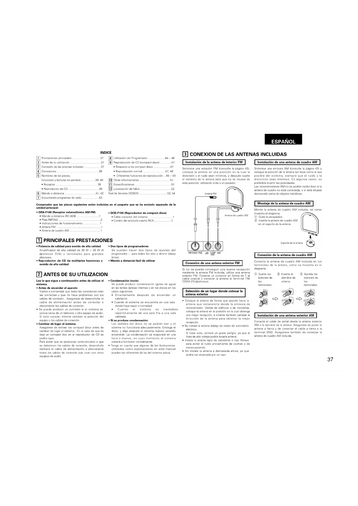 INDICE Prestaciones principales …………………………37 Antes de su utilización ……………………………37 Conexión de las antenas incluidas ………………37 Conexiones ………………………………………38 Nombres de las piezas, funciones y lecturas en pantalla ……………39, 40• Receptor ………………………………………39• Reproductor de CD ……………………………40 Mando a distancia ……………………………41, 42 Escuchando programas de radio ………………43 Utilización del Programador ………………44 ~ 46 Reproducción de CD (compact discs) …………47• Respecto a los compact discs ………………47• Reproducción normal ……………………47, 48 Diferentes funciones de reproducción…48 ~ 50 Otras informaciones ……………………………51 Especificaciones …………………………………51 Localización de fallos ……………………………52Red de Servicio DENON …………………………53, 54