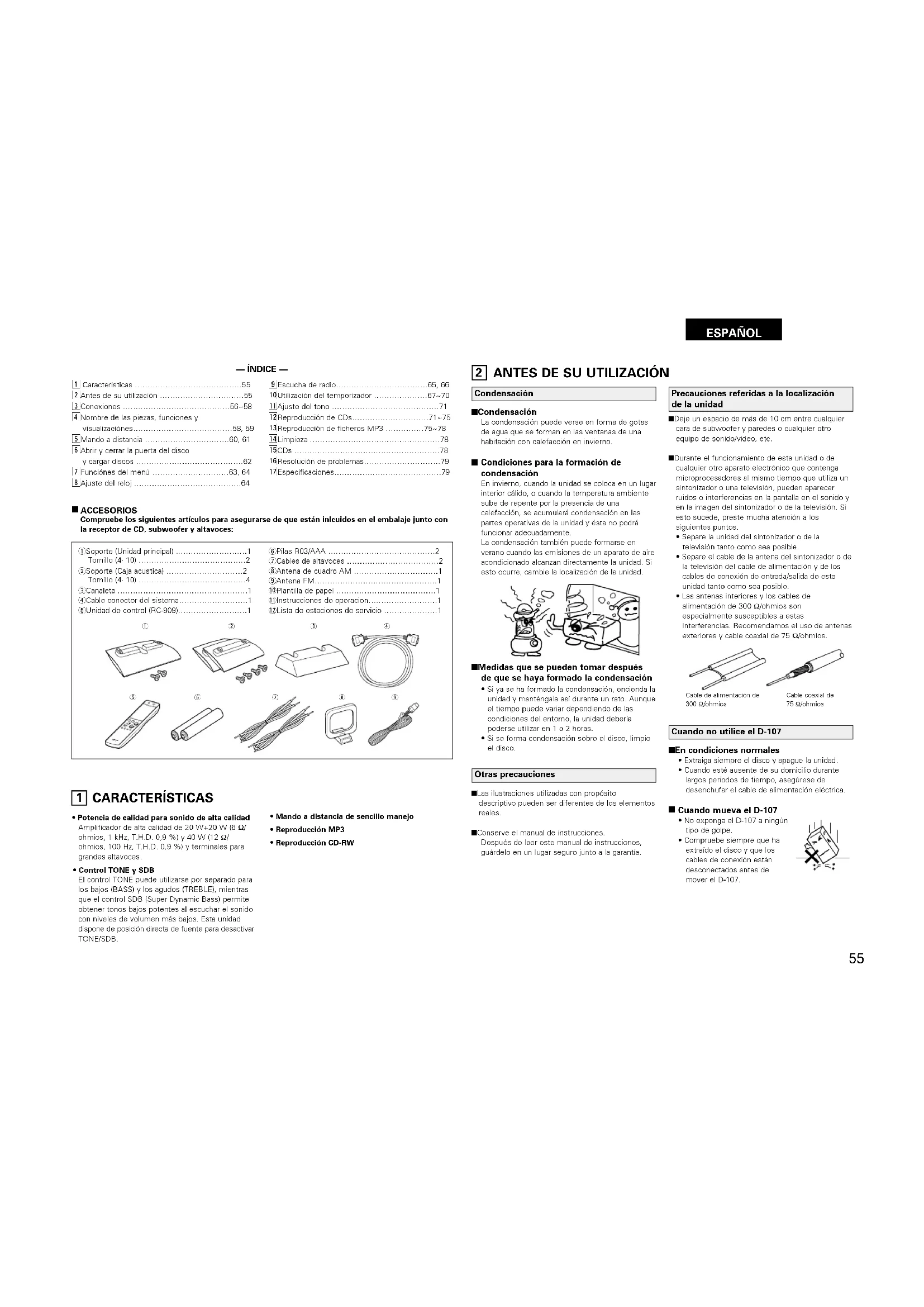 Características ……………………………………55 x Antes de su utilización ……………………………55 c Conexiones ……………………………………56~58 v Nombre de las piezas, funciones y visualizaciónes…………………………………58, 59 b Mando a distancia ……………………………60, 61 n Abrir y cerrar la puerta del disco y cargar discos ……………………………………62 m Funciónes del menú …………………………63, 64 , Ajuste del reloj ……………………………………64 . Escucha de radio………………………………65, 66 ⁄0 Utilización del temporizador …………………67~70 ⁄1 Ajuste del tono ……………………………………71 ⁄2 Reproducción de CDs…………………………71~75 ⁄3 Reproducción de ficheros MP3 ……………75~78 ⁄4 Limpieza ……………………………………………78 ⁄5 CDs …………………………………………………78 ⁄6 Resolución de problemas…………………………79 ⁄7 Especificaciones……………………………………79 q Soporte (Unidad principal) .………………………1Tornillo (4×10) ……………………………………2w Soporte (Caja acustica) …………………………2Tornillo (4×10) ……………………………………4e Canaleta ……………………………………………1r Cable conector del sistema………………………1t Unidad de control (RC-909)………………………1
