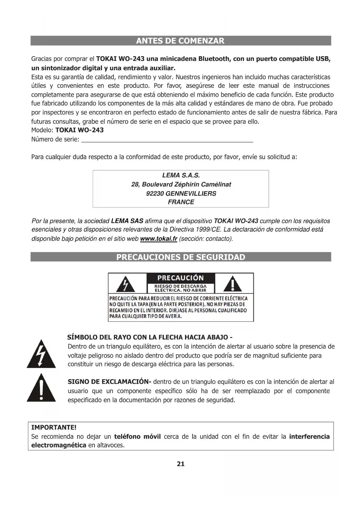 Este símbolo significa que los productos eléctricos y electrónicos usados no deben mezclarse con los desechos domésticos, existe un sistema de recogida selectiva para este tipo de productos. ¡Si desea desechar este equipo, por favor no use el cubo de la basura ordinario! - La presencia de sustancias peligrosas en los equipos eléctricos y electrónicos puede causar potenciales consecuencias sobre el medioambiente y la salud humana en el ciclo del reprocesamiento de ese producto. - Por lo tanto, en el final de su vida útil, este producto no puede ser depositado junto con otros desechos no reciclables. Los equipos eléctricos o electrónicos usados tienen que ser tratados por separado y conforme a las legislaciones que requieren tratamiento, recuperación y reciclaje de equipos eléctricos y electrónicos. - Las autoridades locales y distribuidores han configurado procedimientos especiales a fin de colectar y reciclar este producto, (Por favor contacte su autoridad local para más detalle). Usted está obligado a usar el sistema de recogida selectiva que instala su autoridad local. - Si sus equipos eléctricos o electrónicos usados tienen pilas o acumuladores, por favor elimine por separado con antelación de acuerdo a las necesidades locales. - Al desechar este producto correctamente, usted ayudará a asegurar que los residuos se someten al tratamiento, la recuperación y el reciclado necesario y así se evitan los posibles efectos negativos sobre el medioambiente y la salud humana que de otro modo podrían surgir debido al manejo inadecuado de desechosVOORDAT WE BEGINNEN Dank U voor het kopen van de TOKAI WO-243 MICRO SYSTEM Bluetooth - Digitale FM tuner - USB compatibel en een AUX-ingang. Dit is uw garantie voor kwaliteit, prestatie en waarde. Onze ontwerpers hebben vele nuttige en makkelijke functies ingevoegd in dit product. Leest u alstublieft deze gebruiksaanwijzing compleet door om er zeker van te zijn dat u het grootste voordeel van elke functie behaald. Dit product is ontworpen met gebruik van de hoogste kwalitatieve componenten en standaarden van vakmanschap. Het is getest door onze controleurs en in perfecte goede orde bevonden voordat het onze fabriek verliet. Voor toekomstige referentie, noteer het serienummer in de daarvoor voorzien ruimte. Model Nr: TOKAI WO-243: Serienummer: _______________ Voor eventuele vragen betreffende de conformiteit van het product, kunt u uw verzoek sturen naar:
