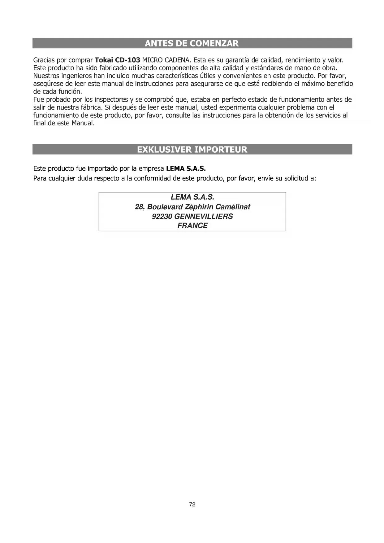 Gracias por comprar Tokai CD-103 MICRO CADENA. Esta es su garantía de calidad, rendimiento y valor. Este producto ha sido fabricado utilizando componentes de alta calidad y estándares de mano de obra. Nuestros ingenieros han incluido muchas características útiles y convenientes en este producto. Por favor, asegúrese de leer este manual de instrucciones para asegurarse de que está recibiendo el máximo beneficio de cada función. Fue probado por los inspectores y se comprobó que, estaba en perfecto estado de funcionamiento antes de salir de nuestra fábrica. Si después de leer este manual, usted experimenta cualquier problema con el funcionamiento de este producto, por favor, consulte las instrucciones para la obtención de los servicios al final de este Manual. EXKLUSIVER IMPORTEUR Este producto fue importado por la empresa LEMA S.A.S. Para cualquier duda respecto a la conformidad de este producto, por favor, envíe su solicitud a: LEMA S.A.S. 28, Boulevard Zéphirin Camélinat 92230 GENNEVILLIERS FRANCE73 ADVERTENCIA PARA PREVENIR INCENDIOS O ELECTROCUCIONES NO EXPONER EL APARATO A LA LLUVIA O HUMEDAD.