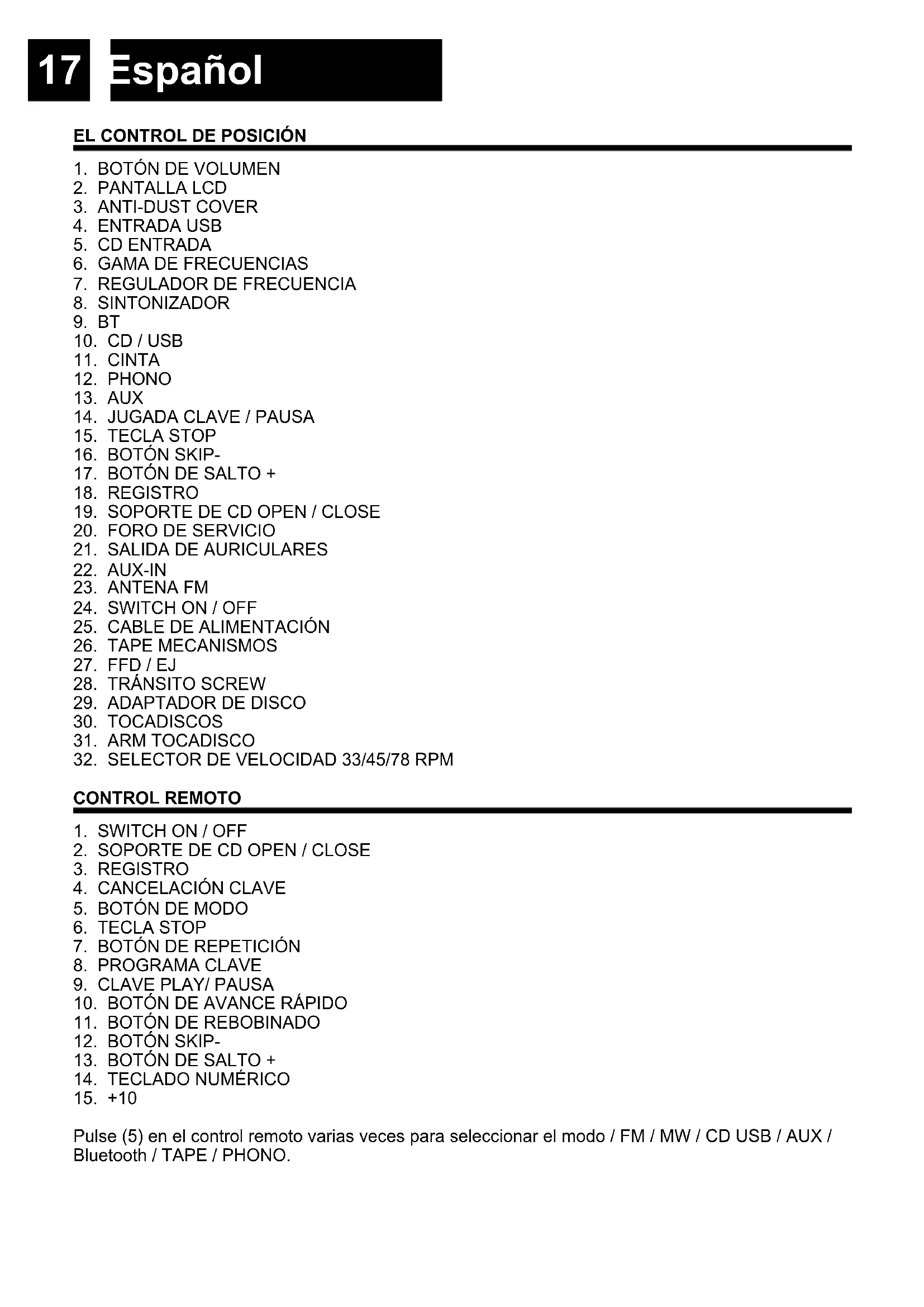Pulse (5) en el control remoto varias veces para seleccionar el modo / FM / MW / CD USB / AUX / Bluetooth / TAPE / PHONO.18 Español POTENCIA Esta unidad utiliza una fuente de alimentación de 230 V ~ 50 Hz. Enchufe en una toma de corriente, asegurándose de que la tensión es tal como se indica en la etiqueta. Conecte la unidad a la corriente. Lugar SWITCH ON / OFF (24) en la posición ON para encender la unidad. Colocar SWITCH ON / OFF (24) en posición OFF para apagar la unidad. Si no hay sonido durante 15 minutos, la unidad se apagará automáticamente. Durante la reproducción, mantenga pulsado PLAY/PAUSE (14) durante X segundos para apagar la unidad. Pulse PLAY/PAUSE (14) de nuevo para continuar jugando