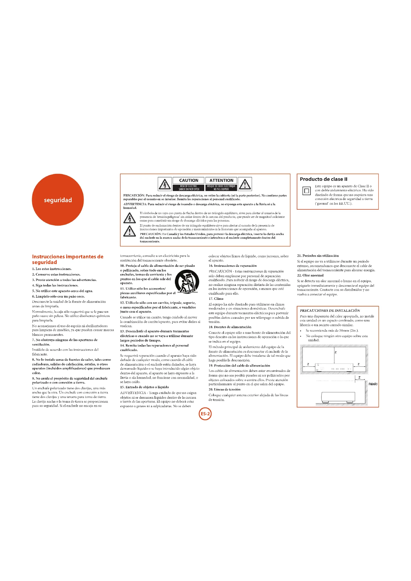 PRECAUCIÓN: Para reducir el riesgo de descarga eléctrica, no retire la cubierta (ni la parte posterior). No contiene partes reparables por el usuario en su interior. Remita las reparaciones al personal cualificado.ADVERTENCIA: Para reducir el riesgo de incendio o descarga eléctrica, no exponga este aparato a la lluvia ni a la humedad.El símbolo de un rayo con punta de flecha dentro de un triángulo equilátero, sirve para alertar al usuario de la presencia de ‘tensión peligrosa’ sin aislar dentro de la carcasa del producto, que puede ser de magnitud suficiente como para constituir un riesgo de descarga eléctrica para las personas.El punto de exclamación dentro de un triángulo equilátero sirve para alertar al usuario de la presencia de instrucciones importantes de operación y mantenimiento en la literatura que acompaña al aparato.PRECAUCIÓN: En Canadá y los Estados Unidos, para prevenir la descarga eléctrica, inserte la clavija ancha del enchufe en la ranura ancha de la tomacorriente e introduzca el enchufe completamente dentro del tomacorriente. Producto de clase II Este equipo es un aparato de Clase II o con doble aislamiento eléctrico. Ha sido diseñado de forma que no requiera una conexión eléctrica de seguridad a tierra (‘ground’ en los EE.UU.).