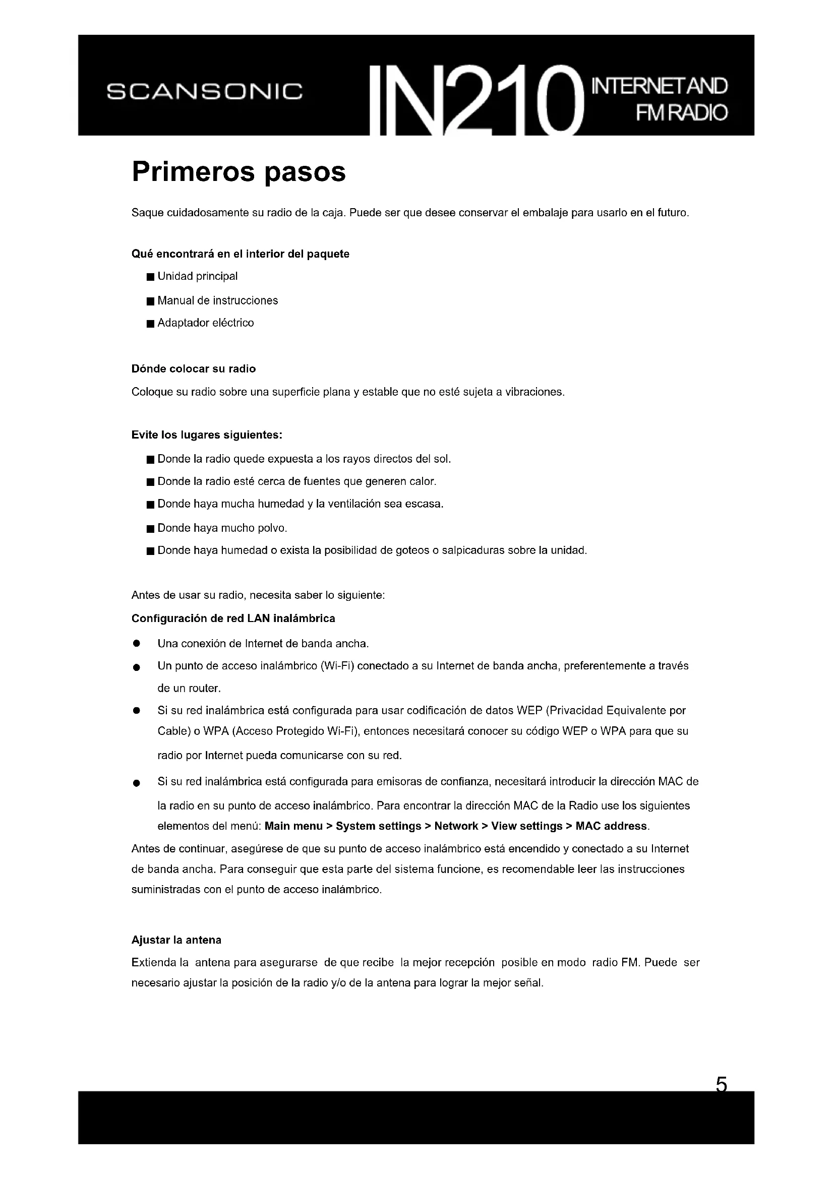 Saque cuidadosamente su radio de la caja. Puede ser que desee conservar el embalaje para usar en el futuro.
