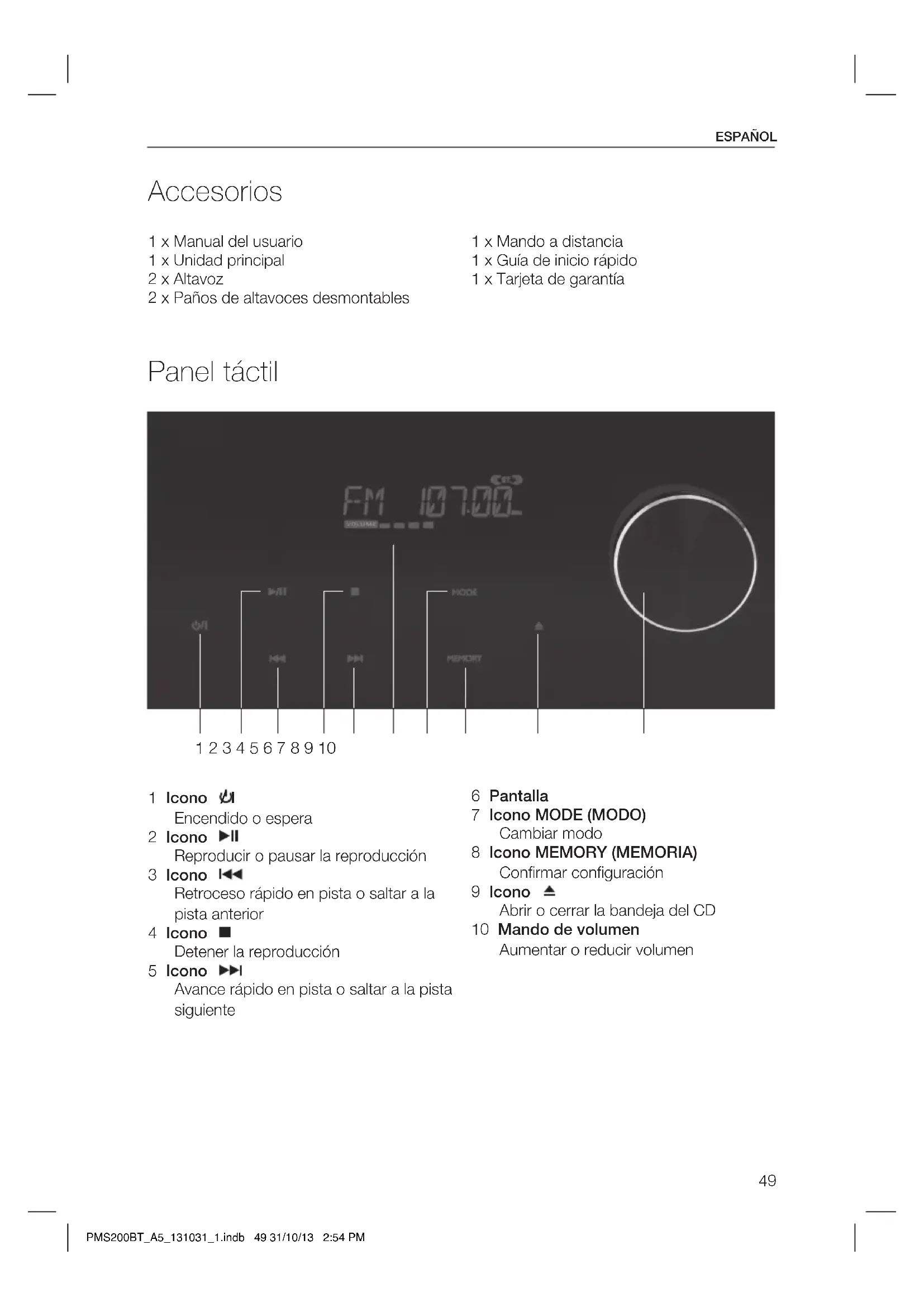 9 Cable de altavoz 10 Antena 11 AUX INPUT (Entrada AUX) 12 OUTPUT (R) (Salida audio) (D) 13 OUTPUT (I) (Salida audio) (L) 14 Interruptor de encendido 15 Cable de alimentación con enchufe PMS200BT_A5_131031_1.indb 48 31/10/13 2:54 PM49 ESPAÑOL 1 x Manual del usuario 1 x Unidad principal 2 x Altavoz 2 x Paños de altavoces desmontables 1 x Mando a distancia 1 x Guía de inicio rápido 1 x Tarjeta de garantía Panel táctil