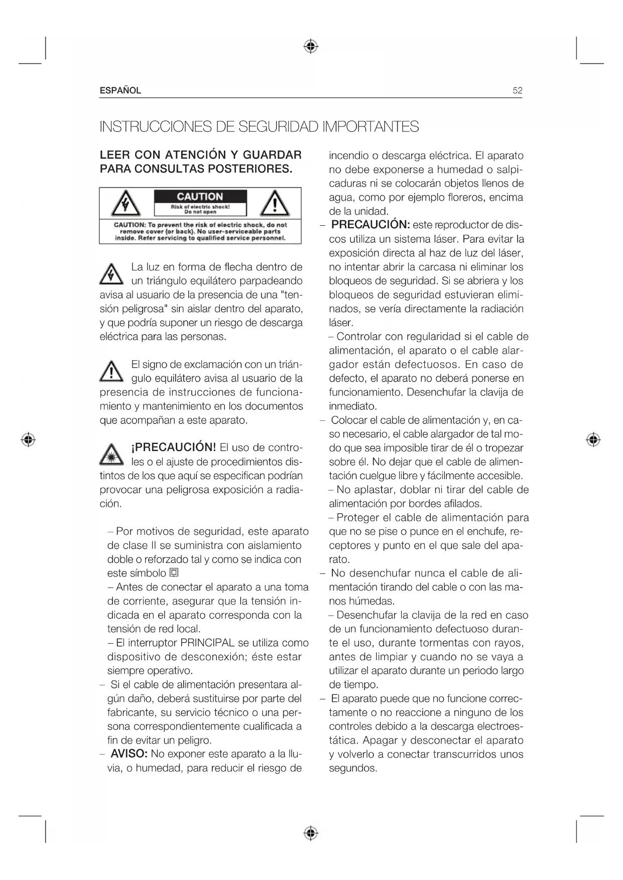 La luz en forma de flecha dentro de un triángulo equilátero parpadeando avisa al usuario de la presencia de una "ten- sión peligrosa" sin aislar dentro del aparato, y que podría suponer un riesgo de descarga eléctrica para las personas. El signo de exclamación con un trián- gulo equilátero avisa al usuario de la presencia de instrucciones de funciona- miento y mantenimiento en los documentos que acompañan a este aparato. ¡PRECAUCIÓN! El uso de contro- les o el ajuste de procedimientos dis- tintos de los que aquí se especifican podrían provocar una peligrosa exposición a radia- ción. – Por motivos de seguridad, este aparato de clase II se suministra con aislamiento doble o reforzado tal y como se indica con este símbolo . – Antes de conectar el aparato a una toma de corriente, asegurar que la tensión in- dicada en el aparato corresponda con la tensión de red local. – El interruptor PRINCIPAL se utiliza como dispositivo de desconexión; éste estar siempre operativo. – Si el cable de alimentación presentara al- gún daño, deberá sustituirse por parte del fabricante, su servicio técnico o una per- sona correspondientemente cualificada a fin de evitar un peligro. – AVISO: No exponer este aparato a la llu- via, o humedad, para reducir el riesgo de