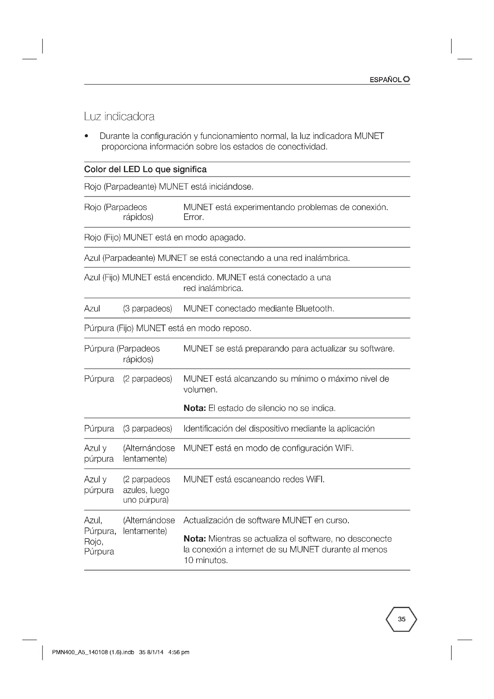 - Durante la configuración y funcionamiento normal, la luz indicadora MUNET proporciona información sobre los estados de conectividad. Color del LED Lo que significa Rojo (Parpadeante) MUNET está iniciándose. Rojo (Parpadeos rápidos) MUNET está experimentando problemas de conexión. Error. Rojo (Fijo) MUNET está en modo apagado. Azul (Parpadeante) MUNET se está conectando a una red inalámbrica. Azul (Fijo) MUNET está encendido. MUNET está conectado a una red inalámbrica. Azul (3 parpadeos) MUNET conectado mediante Bluetooth. Púrpura (Fijo) MUNET está en modo reposo. Púrpura (Parpadeos rápidos) MUNET se está preparando para actualizar su software. Púrpura (2 parpadeos) MUNET está alcanzando su mínimo o máximo nivel de volumen. Nota: El estado de silencio no se indica. Púrpura (3 parpadeos) Identificación del dispositivo mediante la aplicación Azul y púrpura (Alternándose lentamente) MUNET está en modo de configuración WIFi. Azul y púrpura (2 parpadeos azules, luego uno púrpura) MUNET está escaneando redes WiFI. Azul, Púrpura, Rojo, Púrpura (Alternándose lentamente) Actualización de software MUNET en curso. Nota: Mientras se actualiza el software, no desconecte la conexión a internet de su MUNET durante al menos 10 minutos. PMN400_A5_140108 (1.6).indb 35 8/1/14 4:56 pmESPAÑOL