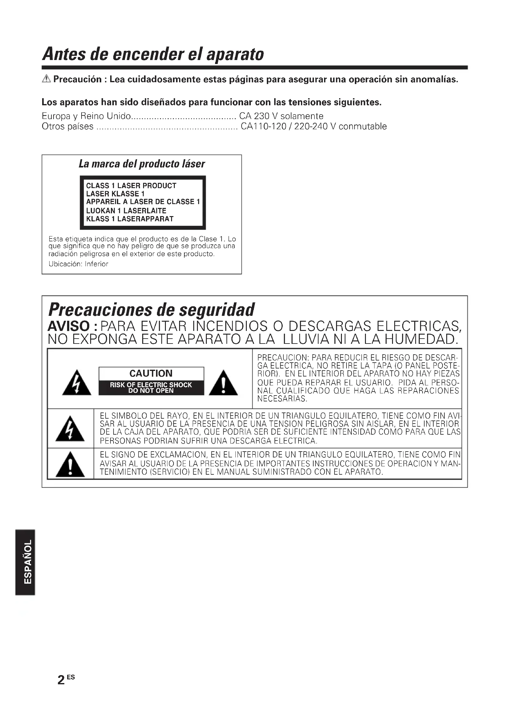 ESPAÑOL Antes de encender el aparato Precaución : Lea cuidadosamente estas páginas para asegurar una operación sin anomalías. Los aparatos han sido diseñados para funcionar con las tensiones siguientes. Europa y Reino Unido......................................... CA 230 V solamente Otros países ....................................................... CA110-120 / 220-240 V conmutable EL SIGNO DE EXCLAMACION, EN EL INTERIOR DE UN TRIANGULO EQUILATERO, TIENE COMO FINAVISAR AL USUARIO DE LA PRESENCIA DE IMPORTANTES INSTRUCCIONES DE OPERACION Y MAN-TENIMIENTO (SERVICIO) EN EL MANUAL SUMINISTRADO CON EL APARATO.EL SIMBOLO DEL RAYO, EN EL INTERIOR DE UN TRIANGULO EQUILATERO, TIENE COMO FIN AVI-SAR AL USUARIO DE LA PRESENCIA DE UNA TENSION PELIGROSA SIN AISLAR, EN EL INTERIORDE LA CAJA DEL APARATO, QUE PODRIA SER DE SUFICIENTE INTENSIDAD COMO PARA QUE LASPERSONAS PODRIAN SUFRIR UNA DESCARGA ELECTRICA.PRECAUCION: PARA REDUCIR EL RIESGO DE DESCAR-GA ELECTRICA, NO RETIRE LA TAPA (O PANEL POSTE-RIOR). EN EL INTERIOR DEL APARATO NO HAY PIEZASQUE PUEDA REPARAR EL USUARIO. PIDA AL PERSO-NAL CUALIFICADO QUE HAGA LAS REPARACIONESNECESARIAS. Precauciones de seguridad AVISO : PARA EVITAR INCENDIOS O DESCARGAS ELECTRICAS, NO EXPONGA ESTE APARATO A LA LLUVIA NI A LA HUMEDAD. CAUTION