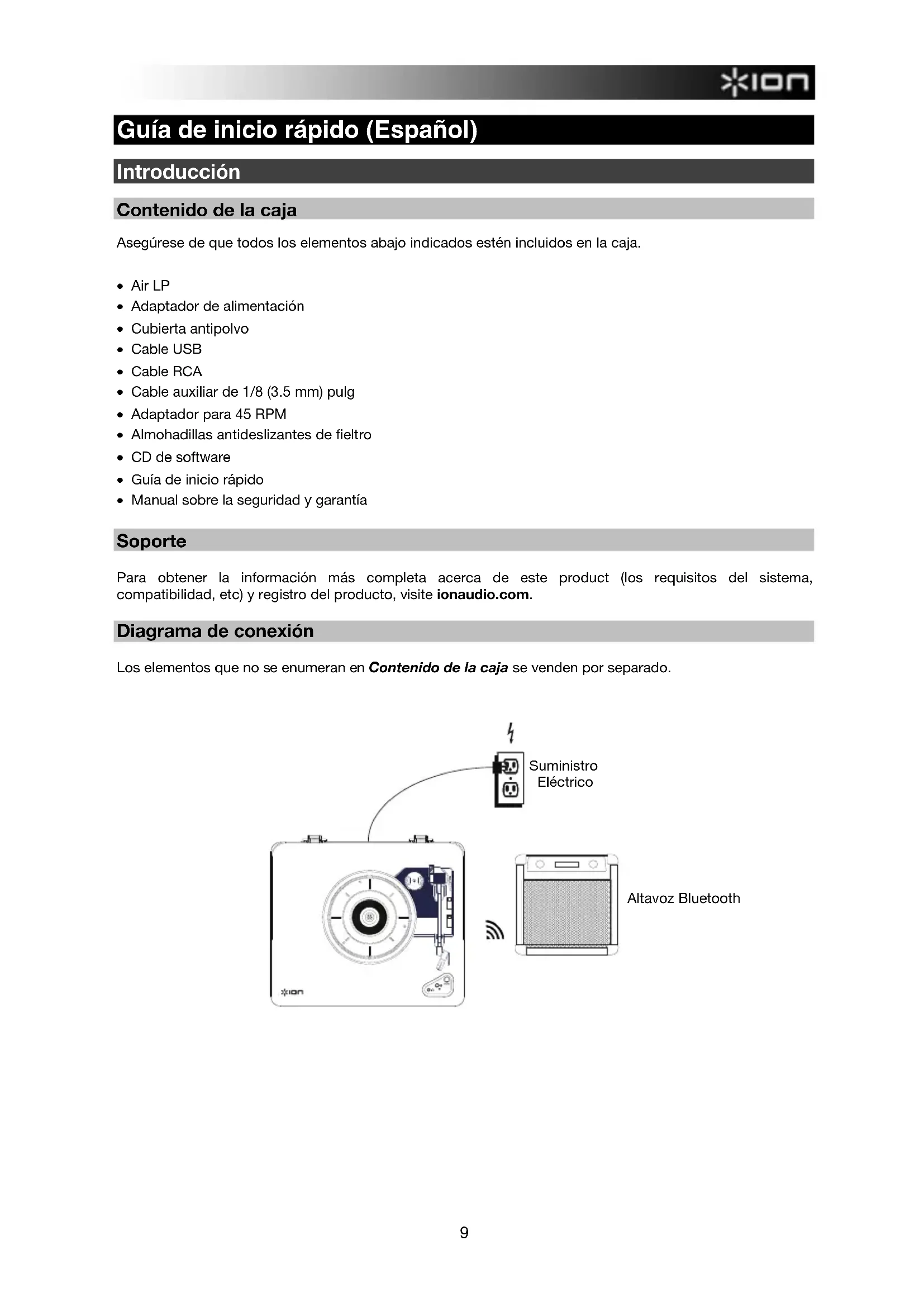 - Manual sobre la seguridad y garantía Soporte Para obtener la información más completa acerca de este product (los requisitos del sistema, compatibilidad, etc) y registro del producto, visite ionaudio.com. Diagrama de conexión Los elementos que no se enumeran en Contenido de la caja se venden por separado.
