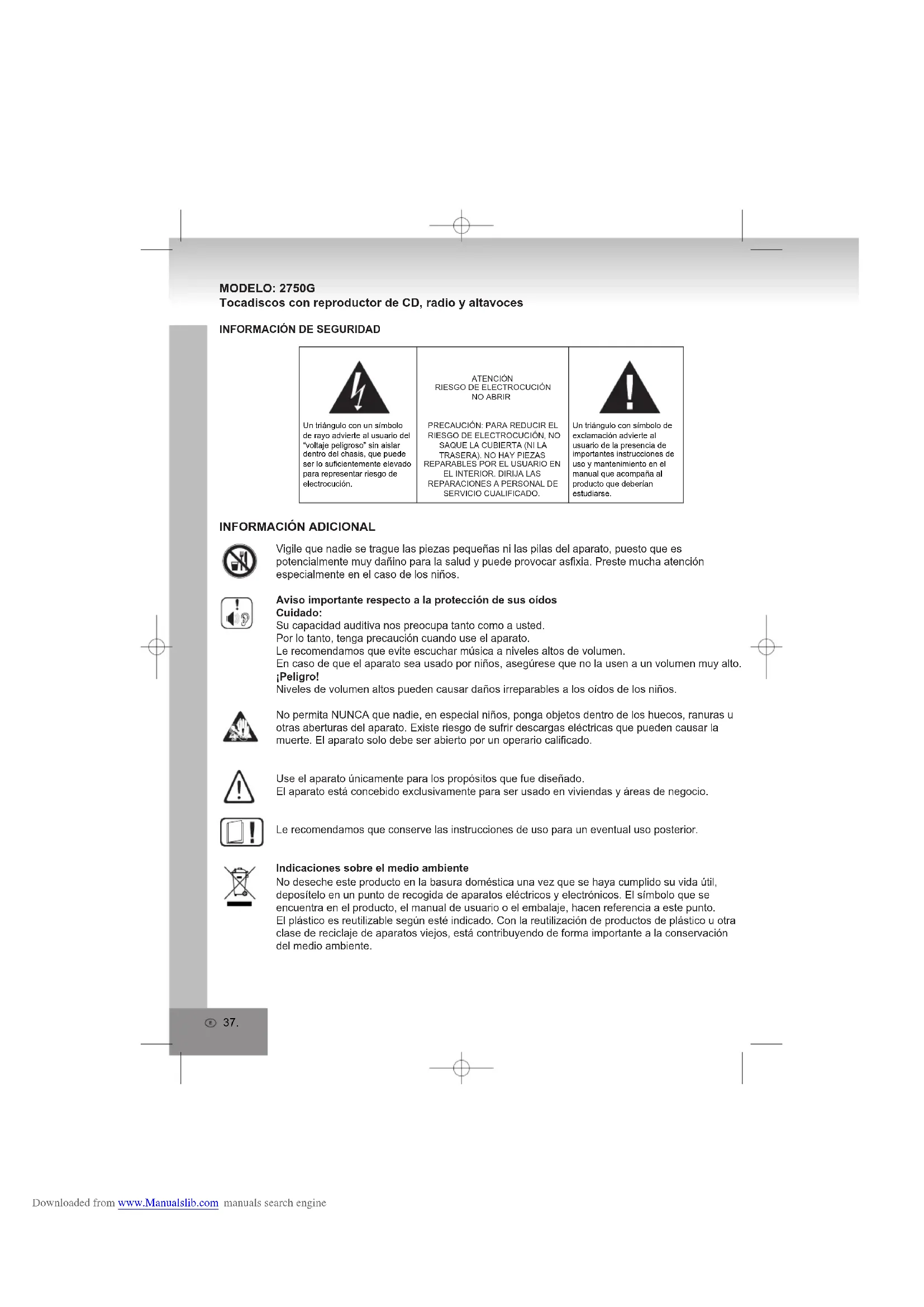 MODELO: 2750G Tocadiscos con reproductor de CD, radio y altavoces Un triángulo con símbolo de exclamación advierte al usuario de la presencia de importantes instrucciones de uso y mantenimiento en el manual que acompaña al producto que deberían estudiarse.Un triángulo con un símbolo de rayo advierte al usuario del “voltaje peligroso” sin aislar dentro del chasis, que puede ser lo suficientemente elevado para representar riesgo de electrocución.ATENCIÓNRIESGO DE ELECTROCUCIÓNNO ABRIRPRECAUCIÓN: PARA REDUCIR EL RIESGO DE ELECTROCUCIÓN, NO SAQUE LA CUBIERTA (NI LA TRASERA). NO HAY PIEZAS REPARABLES POR EL USUARIO EN EL INTERIOR. DIRIJA LAS REPARACIONES A PERSONAL DE SERVICIO CUALIFICADO.Vigile que nadie se trague las piezas pequeñas ni las pilas del aparato, puesto que es potencialmente muy dañino para la salud y puede provocar asfixia. Preste mucha atención especialmente en el caso de los niños.Aviso importante respecto a la protección de sus oídosCuidado:Su capacidad auditiva nos preocupa tanto como a usted.Por lo tanto, tenga precaución cuando use el aparato.Le recomendamos que evite escuchar música a niveles altos de volumen.En caso de que el aparato sea usado por niños, asegúrese que no la usen a un volumen muy alto.¡Peligro!Niveles de volumen altos pueden causar daños irreparables a los oídos de los niños.No permita NUNCA que nadie, en especial niños, ponga objetos dentro de los huecos, ranuras u otras aberturas del aparato. Existe riesgo de sufrir descargas eléctricas que pueden causar la muerte. El aparato solo debe ser abierto por un operario calificado.Use el aparato únicamente para los propósitos que fue diseñado.El aparato está concebido exclusivamente para ser usado en viviendas y áreas de negocio.Le recomendamos que conserve las instrucciones de uso para un eventual uso posterior.Indicaciones sobre el medio ambienteNo deseche este producto en la basura doméstica una vez que se haya cumplido su vida útil, deposítelo en un punto de recogida de aparatos eléctricos y electrónicos. El símbolo que se encuentra en el producto, el manual de usuario o el embalaje, hacen referencia a este punto.El plástico es reutilizable según esté indicado. Con la reutilización de productos de plástico u otra clase de reciclaje de aparatos viejos, está contribuyendo de forma importante a la conservación del medio ambiente. Downloaded from www.Manualslib.com manuals search engine38.