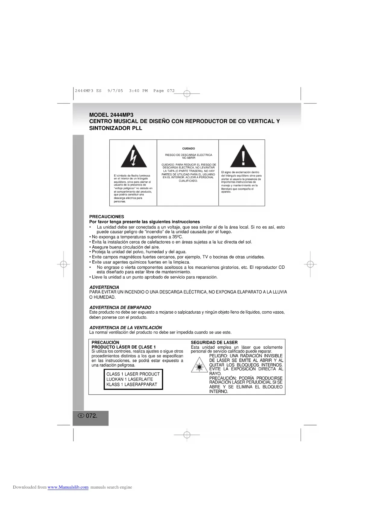 - No engrase o vierta componentes aceitosos a los mecanismos giratorios, etc. El reproductor CD esta diseñado para estar libre de mantenimiento.• Lleve la unidad a un punto aprobado de servicio para reparación.ADVERTENCIAPARA EVITAR UN INCENDIO O UNA DESCARGA ELÉCTRICA, NO EXPONGA ELAPARATO A LA LLUVIAO HUMEDAD.ADVERTENCIA DE EMPAPADOEste producto no debe ser expuesto a mojarse o salpicaduras y ningún objeto lleno de líquidos, como vasos,deben ponerse con el producto.ADVERTENCIA DE LA VENTILACIÓNLa normal ventilación del producto no debe ser impedida cuando se use este.El símbolo de flecha luminosaen el interior de un triánguloequilátero, sirve para alertar alusuario de la presencia de“voltaje peligroso” no aislado enel compartimiento del producto,que podría constituir unadescarga eléctrica parapersonas.CUIDADORIESGO DE DESCARGA ELECTRICANO ABRIRCUIDADO: PARA REDUCIR EL RIESGO DEDESCARGA ELECTRICA, NO LEVANTARLA TAPA (O PARTE TRASERA). NO HAYPARTES DE UTILIDAD PARA EL USUARIOEN EL INTERIOR. ACUDIR A PERSONALCUALIFICADO.El signo de exclamación dentrodel triángulo equilátero sirve paraalertar al usuario la presencia deimportantes instrucciones demanejo y mantenimiento en laliteratura que acompaña elaparato. E 072. MODEL 2444MP3 CENTRO MUSICAL DE DISEÑO CON REPRODUCTOR DE CD VERTICAL Y SINTONIZADOR PLL PRECAUCIÓNPRODUCTO LÁSER DE CLASE 1Si utiliza los controles, realiza ajustes o sigue otrosprocedimientos distintos a los que se especificanen las instrucciones, se podrá estar expuesto auna radiación peligrosa.CLASS 1 LASER PRODUCTLUOKAN 1 LASERLAITEKLASS 1 LASERAPPARATSEGURIDAD DE LASEREsta unidad emplea un láser que solamentepersonal de servicio calificado puede reparar.PELIGRO: UNA RADIACIÓN INVISIBLEDE LÁSER SE EMITE AL ABRIR Y ALQUITAR LOS BLOQUEOS INTERNOS.EVITE LA EXPOSICIÓN DIRECTA ALRAYO.PRECAUCIÓN: PODRÍA PRODUCIRSERADIACIÓN LÁSER PERJUDICIAL SI SEABRE Y SE ELIMINA EL BLOQUEOINTERNO. 2444MP3 ES 9/7/05 3:40 PM Page 072 Downloaded from www.Manualslib.com manuals search engineE 073.E 073. ADVERTENCIA Lea el manual de instrucciones antes de intentar usar la unidad. Maneje con cuidado los paneles de vidrio. Consulte con su distribuidor o personal de servicio si usted tiene alguna pregunta acerca de la instalación, operación o seguridad de la unidad. Asegúrese que la unidad esta conectada a una toma corriente de 230V. Si se usa toma corrientes de voltajes altos estos pueden causar que la unidad funcione mal o se incendie. Asegúrese que todas las conexiones eléctricas (incluyendo las extensiones y los Inter. conectores) estén hechas apropiadamente. Apague la unidad antes de desconectar de la fuente de potencia. No exponga a temperaturas de más de 35 ºC. No ponga la unidad cerca de lugares calientes o en áreas que están sujetas a luz directa del sol. Ponga la unidad en un lugar que tenga Buena circulación de aire. Proteja la unidad del polvo, humedad, agua y otros líquidos. No ponga la unidad cerca de TV., bocinas y otros objetos que generen fuertes rayos magnéticos. No limpie con agentes químicos fuertes. No engrase o ponga componentes aceitosos a los mecanismos giratorios, etc. El reproductor CD esta diseñado para un libre mantenimiento. No intente reparar la unidad por usted mismo. Lleve a un apropiado centro de servicio si es necesaria una reparación. No utilice la unidad si esta no funciona normalmente o si tiene un daño en cualquier componente. Apague la unidad, desconecte de la toma corriente y consulte a personal de servicio técnico. No remueva ninguna cobertura fija. Esto incrementa la posibilidad de una descarga eléctrica. No deje la unidad sin atención cuando esta en función. No escuche con los audífonos en alto volumen. No obstruya la ventilación de la unidad. No intente poner a su criterio otras componentes a la unidad. Solamente use los componentes incluidos. No ponga objetos dentro de ningún hueco, ranura, o aberturas de la unidad. No deje que los niños operen la unidad sin la supervisión de un adulto. Funciones erráticas ocurren si la unidad se usa en habitaciones iluminadas con luces fluorescentes. PRECAUCIÓN – Este reproductor de CD se debe usar solamente con el pie proporcionado por el fabricante. Si se usa con otro puede resultar una inestabilidad causando un posible daño. Acerca de todo