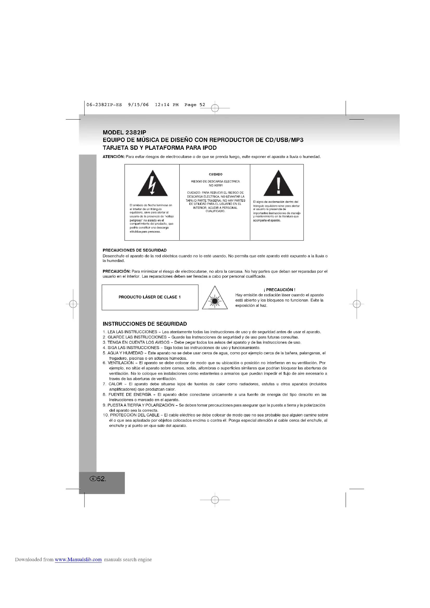 1. LEA LAS INSTRUCCIONES – Lea atentamente todas las instrucciones de uso y de seguridad antes de usar el aparato.2. GUARDE LAS INSTRUCCIONES – Guarde las instrucciones de seguridad y de uso para futuras consultas.3. TENGA EN CUENTA LOS AVISOS – Debe pegar todos los avisos del aparato y de las instrucciones de uso.4. SIGA LAS INSTRUCCIONES – Siga todas las instrucciones de uso y funcionamiento.5. AGUA Y HUMEDAD – Este aparato no se debe usar cerca de agua, como por ejemplo cerca de la bañera, palanganas, elfregadero, piscinas o en sótanos húmedos.6. VENTILACIÓN – El aparato se debe colocar de modo que su ubicación o posición no interfieran en su ventilación. Porejemplo, no sitúe el aparato sobre camas, sofás, alfombras o superficies similares que podrían bloquear las aberturas de ventilación. No lo coloque en instalaciones como estanterías o armarios que puedan impedir el flujo de aire necesario a través de las aberturas de ventilación.7. CALOR – El aparato debe situarse lejos de fuentes de calor como radiadores, estufas u otros aparatos (incluidosamplificadores) que produzcan calor.8. FUENTE DE ENERGÍA – El aparato debe conectarse únicamente a una fuente de energía del tipo descrito en lasinstrucciones o marcado en el aparato.9. PUESTA A TIERRA Y POLARIZACIÓN – Se deben tomar precauciones para asegurar que la puesta a tierra y la polarizacióndel aparato sea la correcta.10. PROTECCIÓN DEL CABLE – El cable eléctrico se debe colocar de modo que no sea probable que alguien camine sobreél o que sea aplastado por objetos colocados encima o contra él. Ponga especial atención al cable cerca del enchufe, alenchufe y al punto en que sale del aparato. E 52. MODEL 2382IP EQUIPO DE MÚSICA DE DISEÑO CON REPRODUCTOR DE CD/USB/MP3