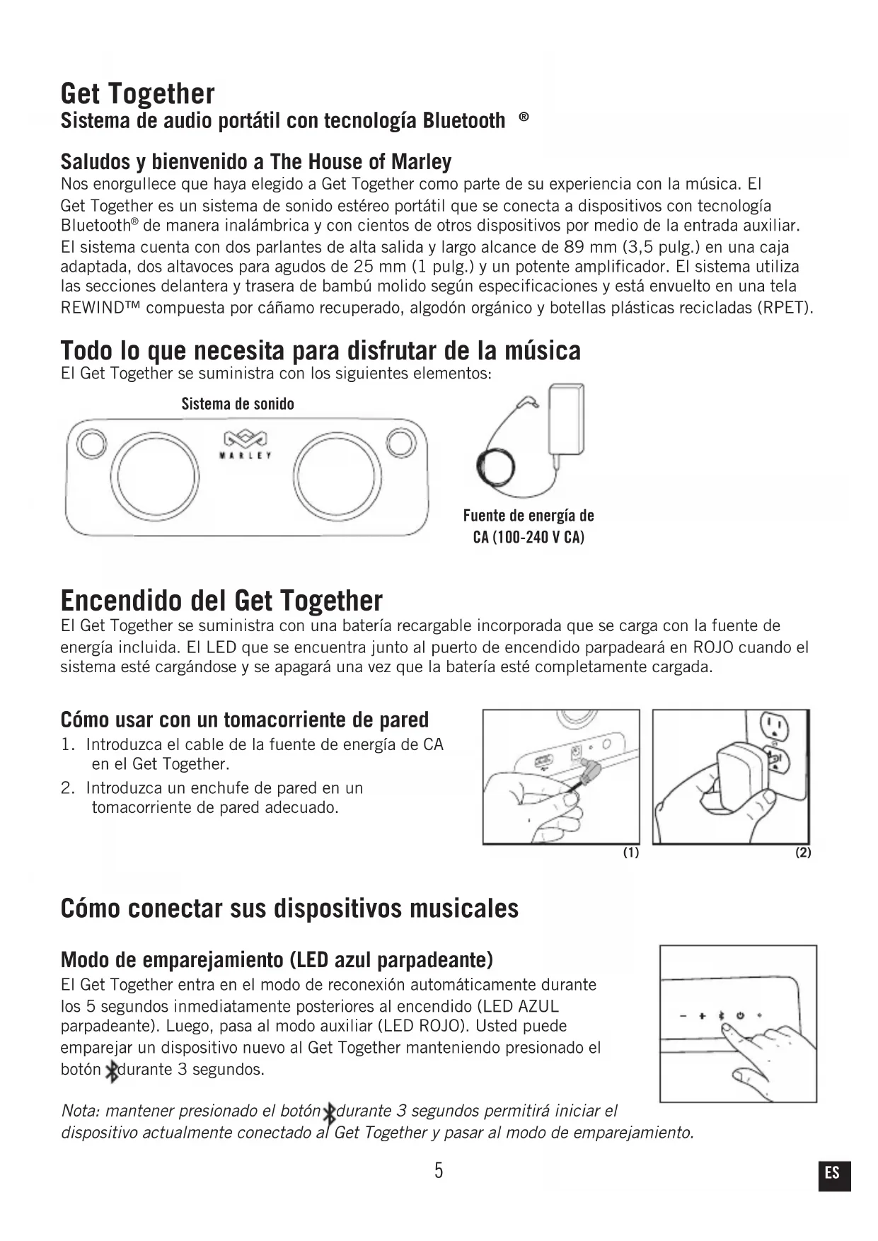 Saludos y bienvenido a The House of Marley Nos enorgullece que haya elegido a Get Together como parte de su experiencia con la música. El Get Together es un sistema de sonido estéreo portátil que se conecta a dispositivos con tecnología Bluetooth