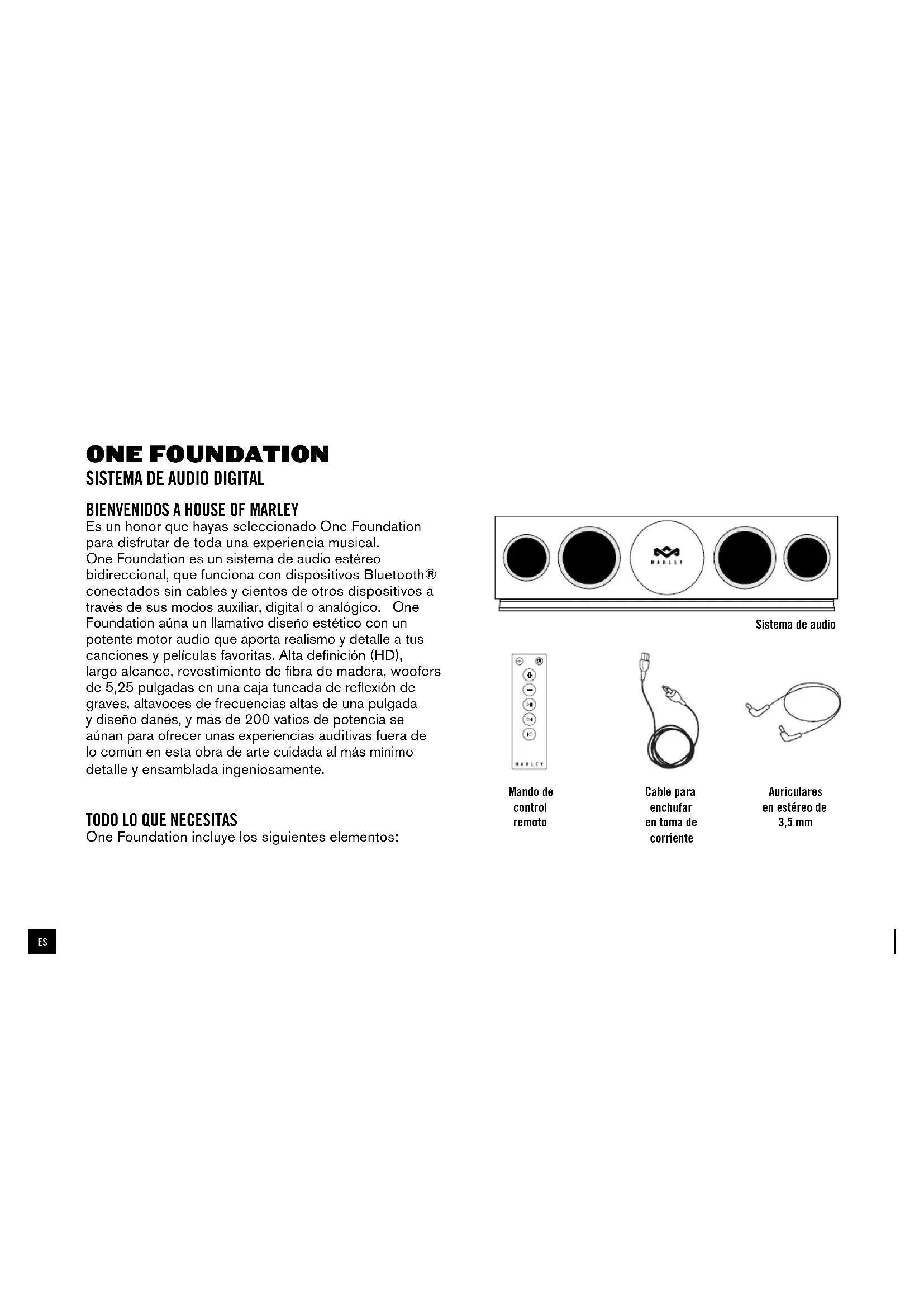 Es un honor que hayas seleccionado One Foundation para disfrutar de toda una experiencia musical. One Foundation es un sistema de audio estéreo bidireccional, que funciona con dispositivos Bluetooth® conectados sin cables y cientos de otros dispositivos a través de sus modos auxiliar, digital o analógico. One Foundation aúna un llamativo diseño estético con un potente motor audio que aporta realismo y detalle a tus canciones y películas favoritas. Alta definición (HD), largo alcance, revestimiento de fibra de madera, woofers de 5,25 pulgadas en una caja tuneada de reflexión de graves, altavoces de frecuencias altas de una pulgada y diseño danés, y más de 200 vatios de potencia se aúnan para ofrecer unas experiencias auditivas fuera de lo común en esta obra de arte cuidada al más mínimo detalle y ensamblada ingeniosamente.