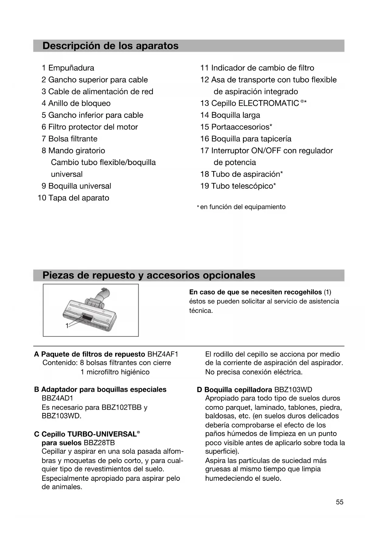 en función del equipamiento A Paquete de filtros de repuesto BHZ4AF1 Contenido: 8 bolsas filtrantes con cierre 1 microfiltro higiénico B Adaptador para boquillas especiales BBZ4AD1 Es necesario para BBZ102TBB y BBZ103WD. C Cepillo TURBO-UNIVERSAL