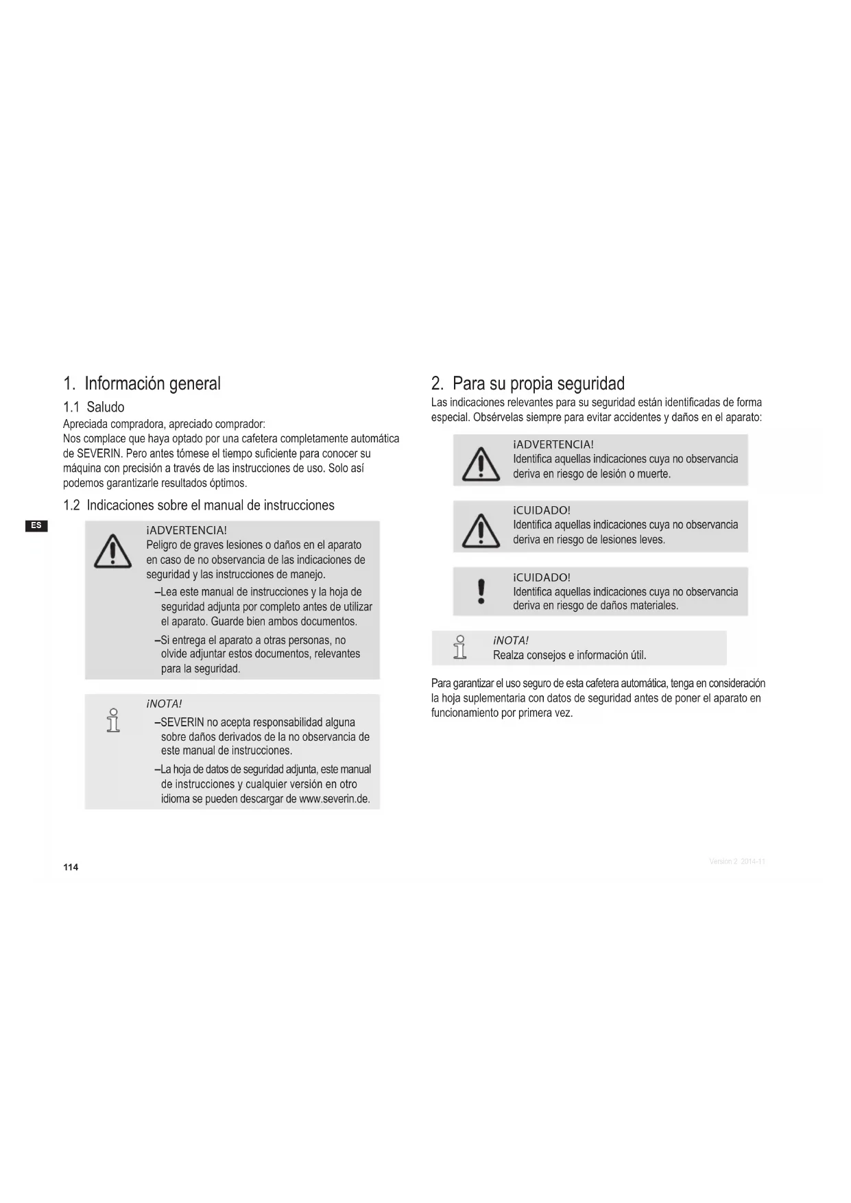 Las indicaciones relevantes para su seguridad están identicadas de forma especial. Obsérvelas siempre para evitar accidentes y daños en el aparato: ¡ADVERTENCIA! Identica aquellas indicaciones cuya no observancia deriva en riesgo de lesión o muerte. ¡CUIDADO! Identica aquellas indicaciones cuya no observancia deriva en riesgo de lesiones leves. ¡CUIDADO! Identica aquellas indicaciones cuya no observancia deriva en riesgo de daños materiales. ¡NOTA! Realza consejos e información útil. Para garantizar el uso seguro de esta cafetera automática, tenga en consideración la hoja suplementaria con datos de seguridad antes de poner el aparato en funcionamiento por primera vez.115 Versión 2 2014-11