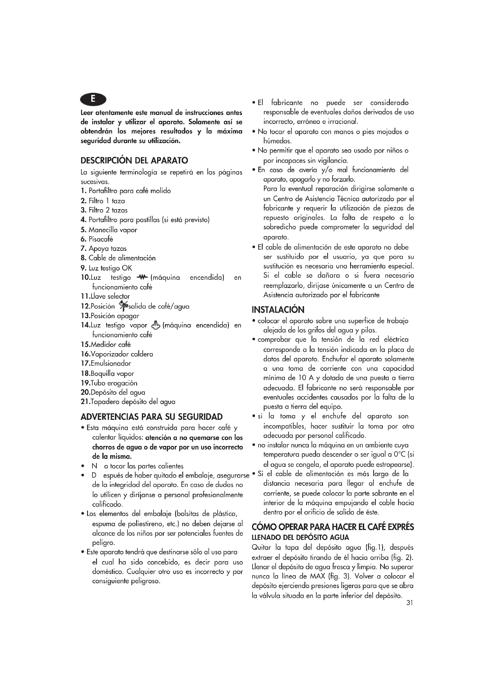 - Esta máquina está construida para hacer café y calentar líquidos: atención a no quemarse con los chorros de agua o de vapor por un uso incorrecto de la misma.