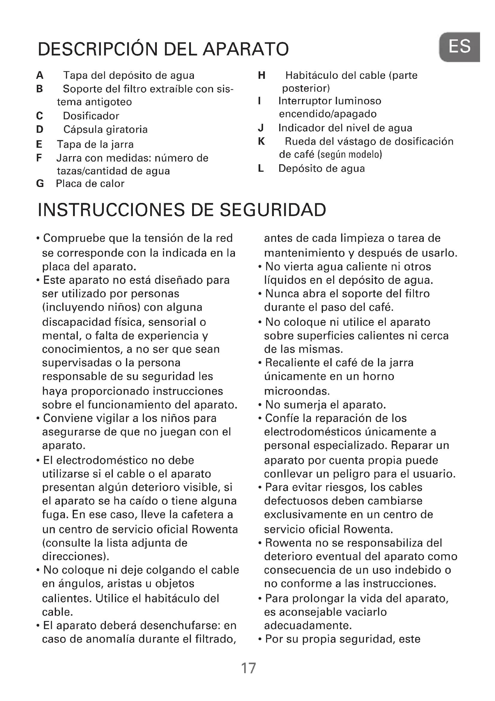 H Habitáculo del cable (parte posterior) I Interruptor luminoso encendido/apagado J Indicador del nivel de agua K Rueda del vástago de dosificación de café (según modelo) L Depósito de agua A Tapa del depósito de agua B Soporte del filtro extraíble con sis- tema antigoteo C Dosificador D Cápsula giratoria E Tapa de la jarra F Jarra con medidas: número de tazas/cantidad de agua G Placa de calor antes de cada limpieza o tarea de mantenimiento y después de usarlo.